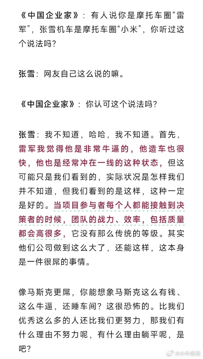 从昨天开始,就看到有一些人拿着张雪的采访,故意截取某些片段,把张雪当枪使,黑雷军、黑小米了。我都不知道这些人看过采访原文没有?来,我给你们看!张雪明明白白说雷军“非常牛逼”,夸小米的团队效率“很屌”,明明白白地表达出了对雷军的敬佩,结果到了黑子嘴里,就成了张雪炮轰雷军,张雪不喜欢雷军了?说白了,张雪无非是给挖孔机盖事件提了一个他的个人建议:退差价、给未提车用户退单。他自己都承认这点钱对小米来说忽略不计,本质是站在用户和品牌口碑的角度,给了一个双赢的解决方案,怎么就成了diss雷军,瞧不上雷军了?小米当时已经给出了补偿方案:2万积分、改选配,最后还免费升级挖孔机盖,只是张雪的建议是直接退钱。结果媒体为了流量,选择性报道,把建议说成批评,把敬佩说成不满,又是一切向流量看的打法。而且事后来看,当初喊着退单的,90%都是黄牛,想借着舆论炒订单、赚差价,真正的车主只是被带了节奏、当了工具人。张雪机车在摩托车赛道打破外资垄断,小米汽车在新能源赛道实现弯道超车,明明两个都是中国品牌的骄傲,为什么有些人就急着跳出来搞对立呢?希望未来的舆论场,多一点完整的真相,少一点断章取义的炒作,多一点对创业者的尊重,少一点为了流量的恶意解读吧。张雪谈雷军与挖孔机盖事件