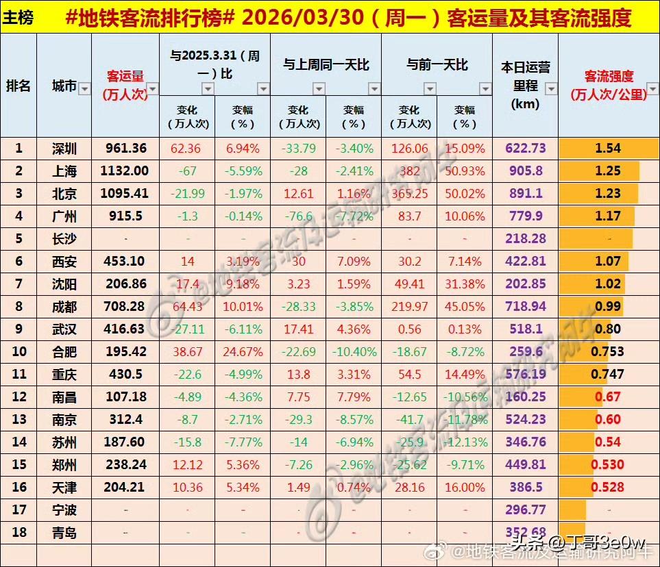 合肥地铁客流量周一未突破200万人次,为195万多 爆料 身边事 排行榜 周一 合肥 2026年3月30日 星期① 全国重点城市轨道交通客流量排行榜: 上海:1132.00万 北京:1095.41万北京身边事 深圳:961.36万 广州:915.50万广州地铁 成都:708.28万成都地铁 西安:453.10万西安身边事 重庆:430.50万重庆爆料 武汉:416.63万 南京:312.40万南京地铁 长沙:238万+ 郑州:238.34万郑州爆料 沈阳:206.86万沈阳身边事 天津:204.21万天津地铁 合肥:195.42万 苏州:187.60万苏州爆料 青岛:107万+青岛身边事 宁波:107万+宁波地铁 南昌:107.18万