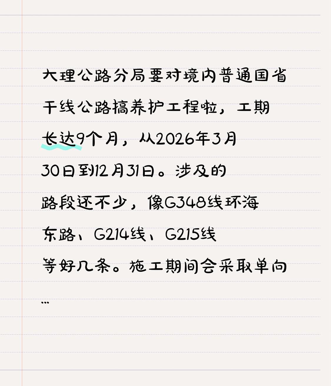 大理公路分局要对境内普通国省干线公路搞养护工程啦,工期长达9个月,从2026年3月30日到12月31日。涉及的路段还不少,像G348线环海东路、G214线、G215线等好几条。 施工期间会采取单向放行、间歇式封闭等方式。这意味着出行可能会受影响,开车经过这些路段可得多留意。无关车辆和行人禁止进入施工现场,大家都得服从交通管制人员指挥。虽然施工会带来不便,但也是为了提高公路安全服务水平,让以后出行更安全,就盼着工程能顺利完成吧。