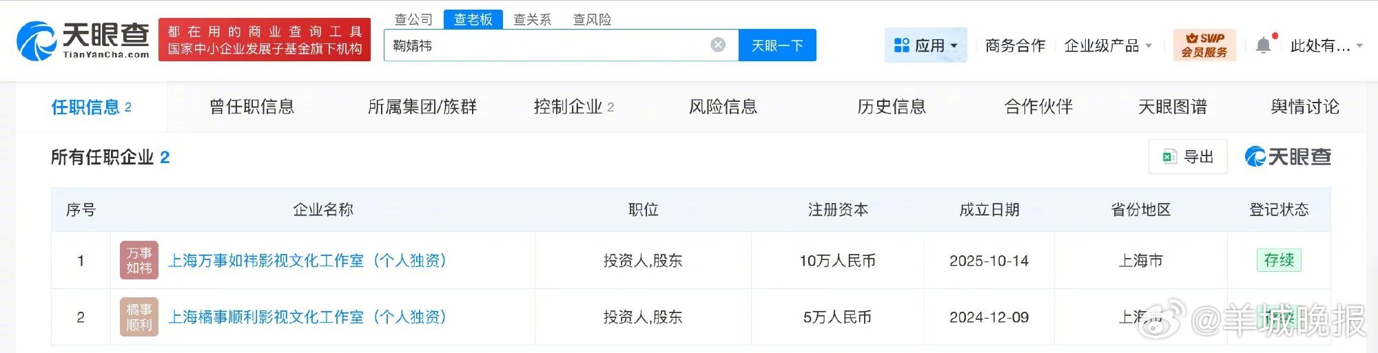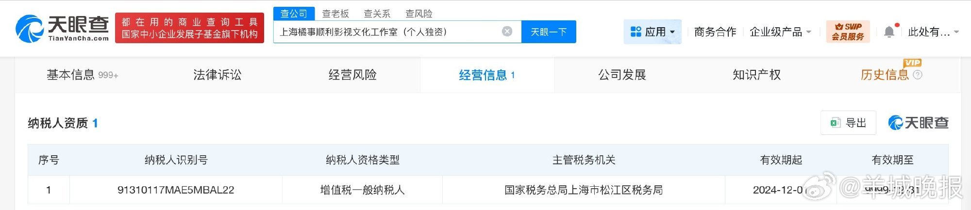 【#鞠婧祎名下工作室均为一般纳税人##鞠婧祎两工作室为增值税一般纳税人#】据媒体报道,3月31日,一张丝芭传媒实名举报鞠婧祎的举报信登上热搜,合约纠纷持续升级,双方矛盾已从合约效力争议蔓延至税务问题。天眼查App显示,鞠婧祎名下共关联2家企业,分别为上海橘事顺利影视文化工作室(个人独资)、上海万事如祎影视文化工作室(个人独资),上述两家工作室均为鞠婧祎个人独资企业。值得一提的是,纳税人资质信息显示,上述两工作室均为增值税一般纳税人。(扬子晚报)更多消息:#鞠婧祎工作室声明##曝迪丽热巴滞留迪拜原因##月鳞绮纪定档删了范世錡##张婉婷 高露##鞠婧祎方否认偷税漏税#(编辑:惠天骄;审签:谢杨柳)