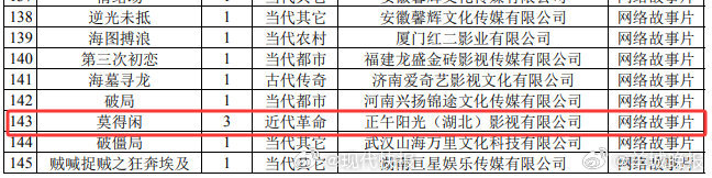 【#正午阳光莫得闲备案公示#】3月31日,国家广播电视总局办公厅发布关于2026年3月全国拍摄制作电视剧(网络剧)备案公示的通知。其中, 网络故事片《莫得闲》显示为3集,题材是近代革命,申报单位为正午阳光(湖北)影视有限公司。据了解,莫得闲是电影《得闲谨制》中由演员饰演的核心角色,是金陵兵工厂钳工。3月27日,2026亚洲艺术电影节金海燕奖提名名单公布,肖战凭借莫得闲一角获最佳男主角提名。(现代快报)更多消息:#鞠婧祎工作室声明##曝迪丽热巴滞留迪拜原因##月鳞绮纪定档删了范世錡##张婉婷 高露##鞠婧祎方否认偷税漏税#(编辑:惠天骄;审签:谢杨柳)