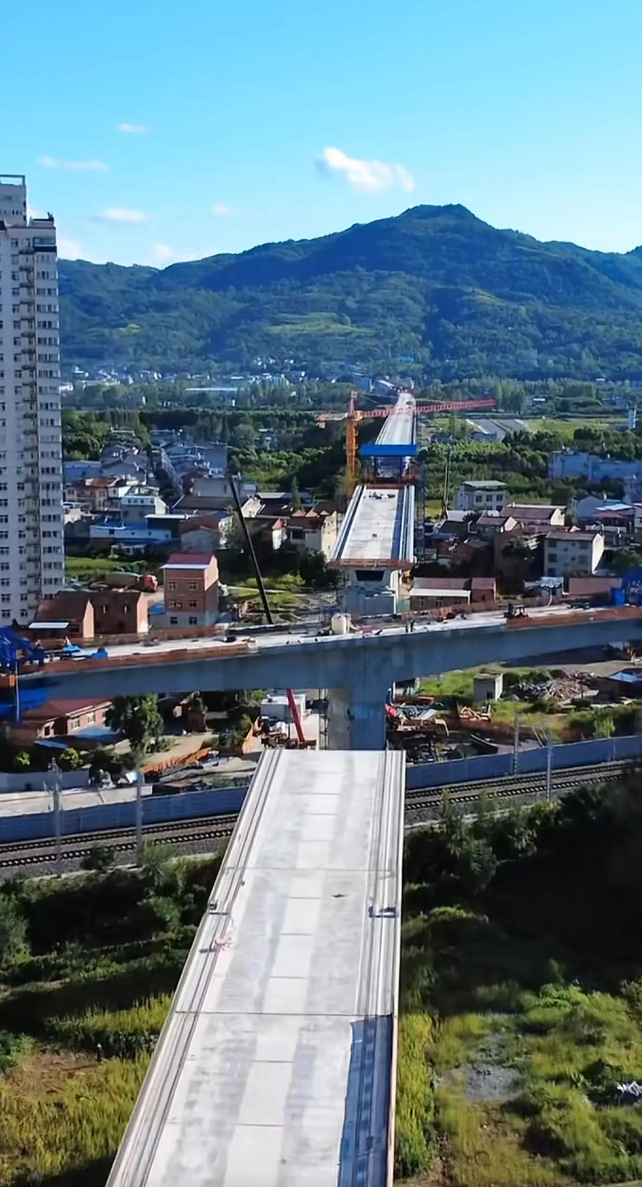 恭喜康渝高铁转体桥成功实现转体,为基建狂魔、大国工匠点赞👍🏻。图一是今天刚刚转体后的样子,施工队燃放鞭炮庆祝,图二是早期施工的桥梁原貌。因为下面是普铁阳安线,为了施工安全和原有铁路安全,所以设计的转体桥。目前,高铁站以西的桥梁眼看就要全线合拢了。