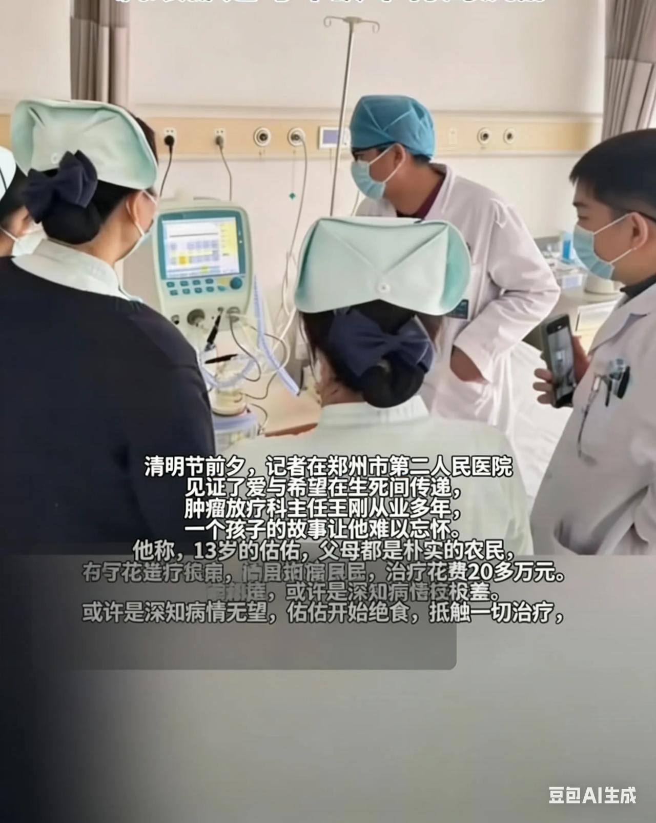 患癌少年为何绝食逼父母生二胎?遗愿看哭无数人 监护仪的滴答声揪着人心。 病房里。13岁的佑佑已经三天水米未进,瘦得只剩下一层皮裹着骨头,可他盯着爸妈的眼神,却硬得像块石头。谁也想不到,这个即将走到生命尽头的孩子,会用最残忍的绝食,逼着最爱他的父母,再生一个孩子。 2026年3月下旬,河南郑州市第三人民医院肿瘤病房。佑佑确诊恶性肿瘤后,这个本就普通的农村家庭被彻底拖进深渊。二十多万积蓄砸光,亲戚邻里借遍,父亲熬白了头,母亲整日以泪洗面,所有人都在拼尽全力,想留住这个才刚刚懂事的孩子。 佑佑什么都懂。 他看懂了医生欲言又止的表情,看懂了父母深夜躲在走廊里的哭声,看懂了这个家,已经被他的病压得快要垮掉。于是他选择了最让人心碎的反抗——绝食。 母亲端来粥,他把头扭开;护士劝他喝水,他紧闭嘴唇。无论谁劝,他只重复一句话: “别治了,我走以后,你们生个二胎吧,不然老了没人管。” 他不是不怕死,他是太怕爸妈以后孤单。 别的13岁少年还在撒娇打闹,他却在病床上盘算自己的离开。他怕自己走后,家里冷冷清清;怕逢年过节,爸妈对着空房间掉泪;怕父母老了病了,连个端茶倒水的人都没有。他用绝食逼父母放弃他,不是狠心,是他能给爸妈留下的,最后一条活路。 生命最后那个深夜,佑佑用尽全身力气抓住父母的手,声音轻得像风,却字字砸心: “爸,妈,我走后把遗体捐了,给医院研究癌症。别再让别的孩子,像我一样疼了。” 话音落下,整个病房哭到窒息。 一个十几岁的孩子,在生命最后时刻,不想好吃的、不想好玩的,想的是父母的晚年,想的是素不相识的陌生人,想的是让后来的人,不要再走他这条绝路。 第二天清晨,佑佑安静地走了。家人遵照遗愿,将他的遗体捐献用于癌症医学研究。这个短暂来过人间的少年,用自己最后的光,照亮了别人的求生路。 他才13岁,却活成了很多大人都比不上的模样。 看完这个少年的故事,你最心疼哪一幕?你觉得他的选择,值不值得我们所有人致敬? 13岁患癌少年捐遗体 河南少年佑佑 人间大爱 信息来源:大象新闻、大河报 网络截图
