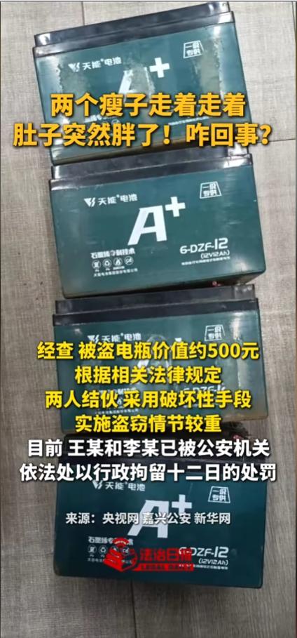 “有猫腻儿!”近日,浙江嘉兴,一男子把电瓶车放在了路边,结果晚上电瓶竟然被偷走了。监控显示,有两个男子进出过停车区域,一来一回二十多分钟,肚子却大了不少,神情也变得有些慌张。一查果然是他们两个偷的!网友:还能跑得了你! 自天网工程实施以来,大街小巷都安装了摄像头,极大地打击了犯罪分子的嚣张气焰,给警察破案提供了相当大的助力。哪怕是处在监控盲区,通过周边监控的印证,也能找出蛛丝马迹,将犯罪分子抓获。 据媒体3月29日报道,焦先生的电动车坏了,就在路边放了一天,准备第二天再推走维修。可到了他要去修车的时候,一推感觉很不对劲,车子轻了不少。 焦先生仔细一看,才发现自己车让人给光顾了。电池仓的舱盖被人用工具暴力撬开,里面的电池不翼而飞。他赶紧报了警。警方发现,事发所在地处于监控盲区,只能从周边的监控视频里寻找线索。 通过排查,他们找到了可疑人物。凌晨三点的时候,有两个瘦瘦的男子,朝焦先生停车的地方走去。不到二十分钟的时间,两个人又折返了回来,但是肚子却大了一圈,而且边走还边东张西望,跟干了亏心事一样。 果然,警方找到两人后,他们很快就交代了。就是他们两个人,结伙盗走了电瓶,价值500多块。两人也被警方依法拘留十二日。 网友看后表示,藏起来就看不见了?自欺欺人罢了!记住一句话,要想人不知,除非己莫为!奉劝大家不要动歪心思,不要做违法乱纪的事! 信息来源:《两个瘦子走着走着,肚子突然胖了!咋回事?》法制日报