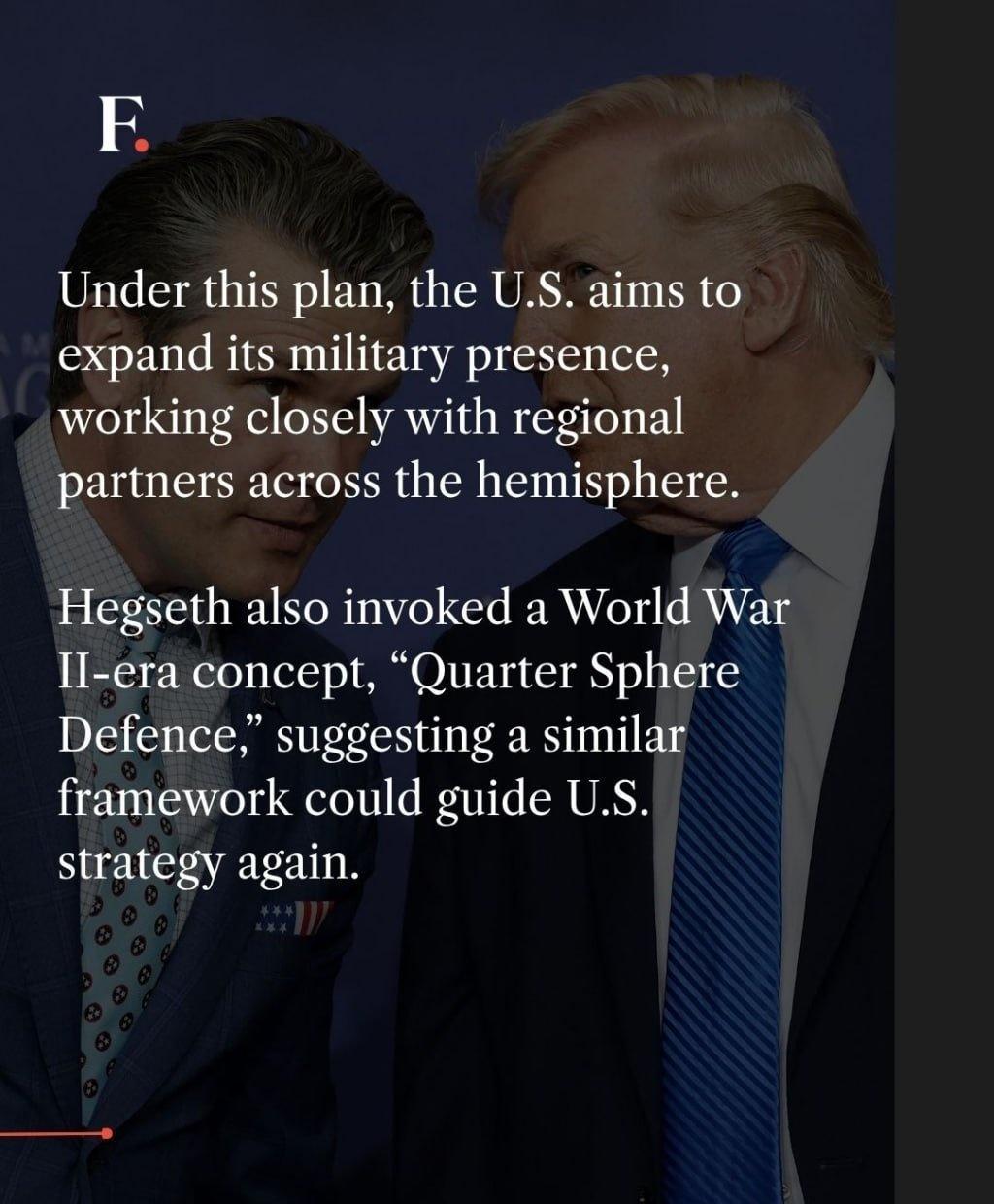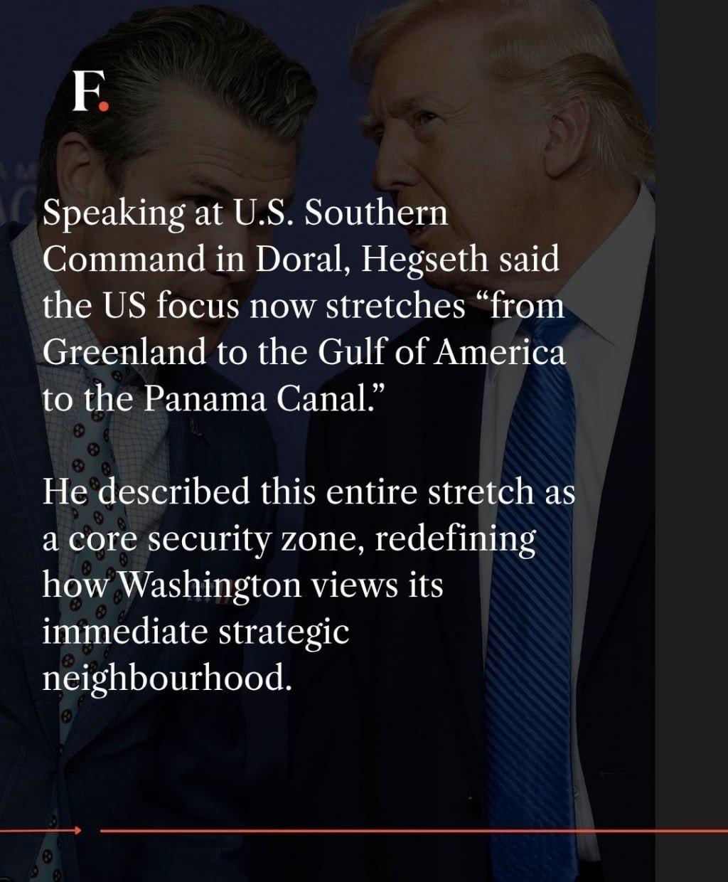美国公布了其占领整个西半球的地图 国防部长皮特·赫格塞斯提出了一项地缘政治愿景,将格陵兰岛、加勒比海地区及该地区其他国家纳入“美国势力范围内的共同安全空间”。 他将“从格陵兰岛到巴拿马运河”的领土划定为该区域的边界,其中包括赤道以北的国家,从格陵兰岛到厄瓜多尔,以及从阿拉斯加到圭亚那。 他强调,这一区域应被视为一个单一的战略边界,与美国的利益直接相关,而非“全球南方”的一部分。 在此框架下,计划包括扩大美国军事存在并深化与区域伙伴的合作。 赫格塞斯还提到了第二次世界大战时期的概念:将世界划分为大片的责任区和防御区,他建议将其视为现代战略的一个可能模型。