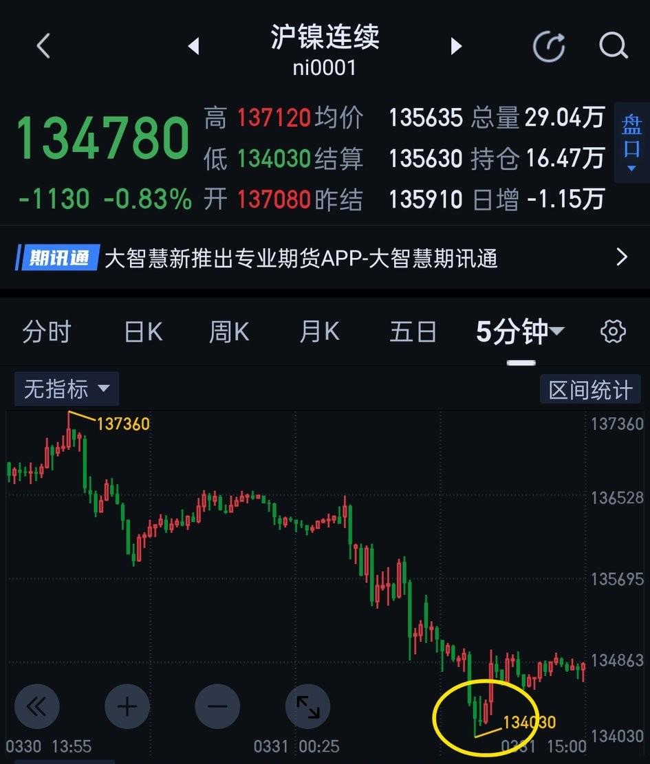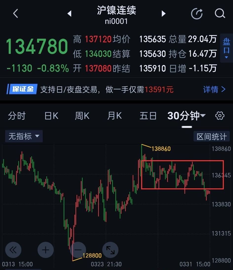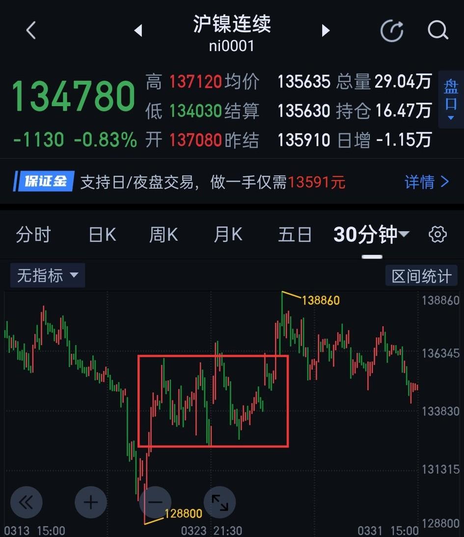 沪镍,目前多、空均难言高度。不适合参与,只适合打磨技术。 日盘沪镍跌破图(1)的多空分界线,短期又进入空头的属地。 夜盘,需观察134030能否有效站稳。站稳,将重回图(3)区间震荡。若不能站稳,将测试图(4)区间的支撑。 沪镍近期如围绕图(3)形成三卖,可适当做空。围绕图(3)形成三买,可择机做多。其余选择观望为宜。