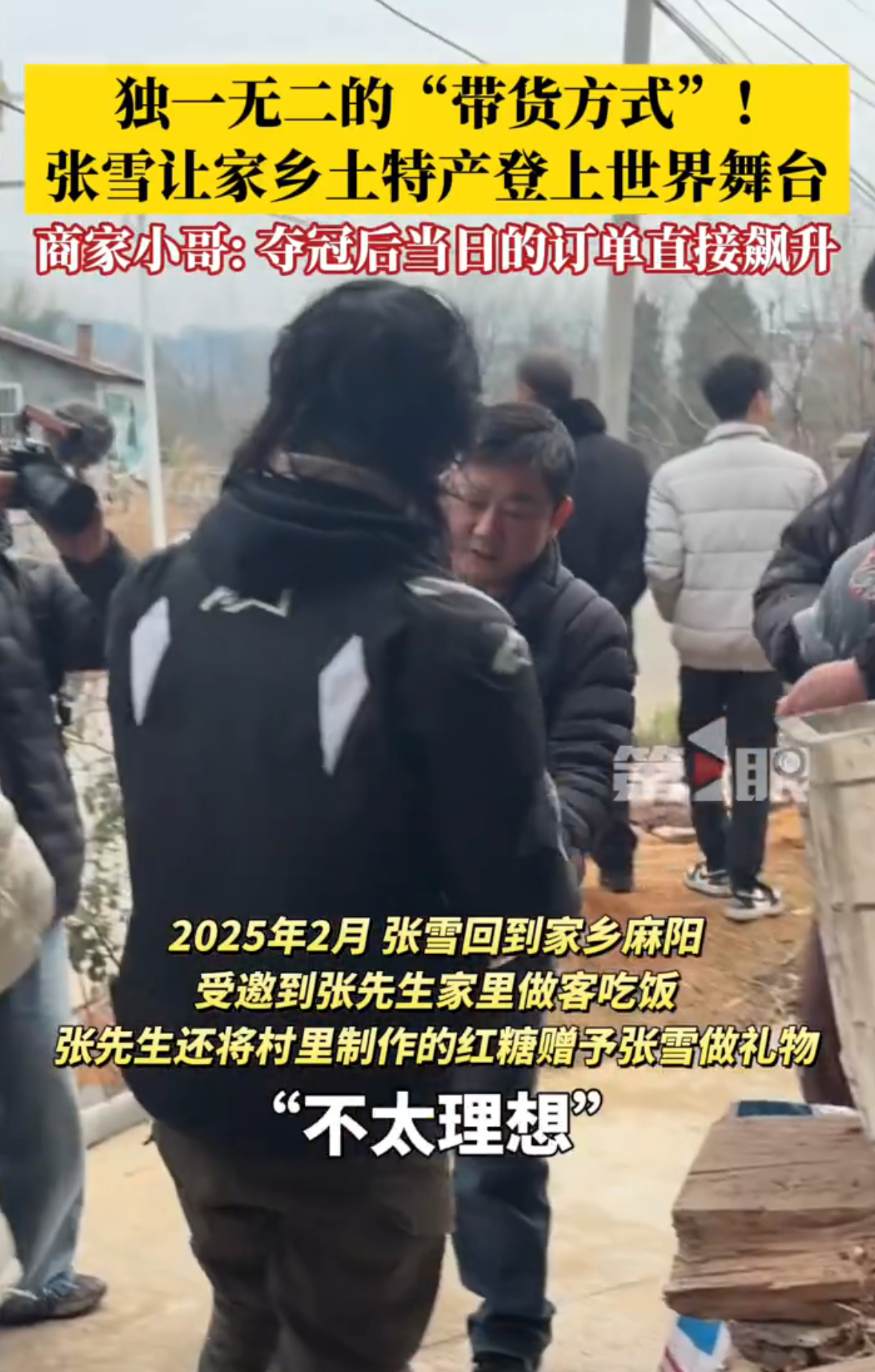 🔻夺冠赛车上,这里写着几个字:“麻阳古法红糖”。🔻免费贴的。🔻这是他家乡麻阳县舒家村乡狮子湾村销路不好的红糖,村里种了五六百亩甘蔗,以前靠农户自己卖或者等人来收,要卖到八九月份。🔻现在爆单了。张雪热点现场