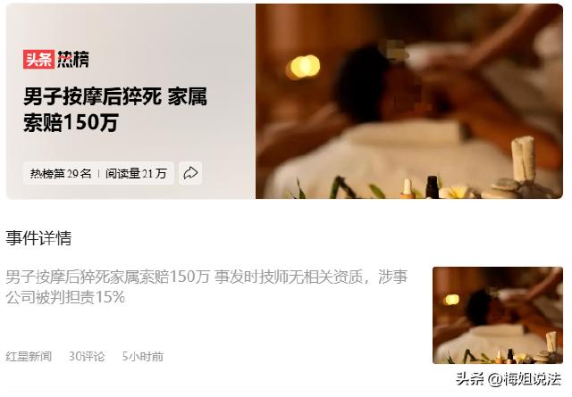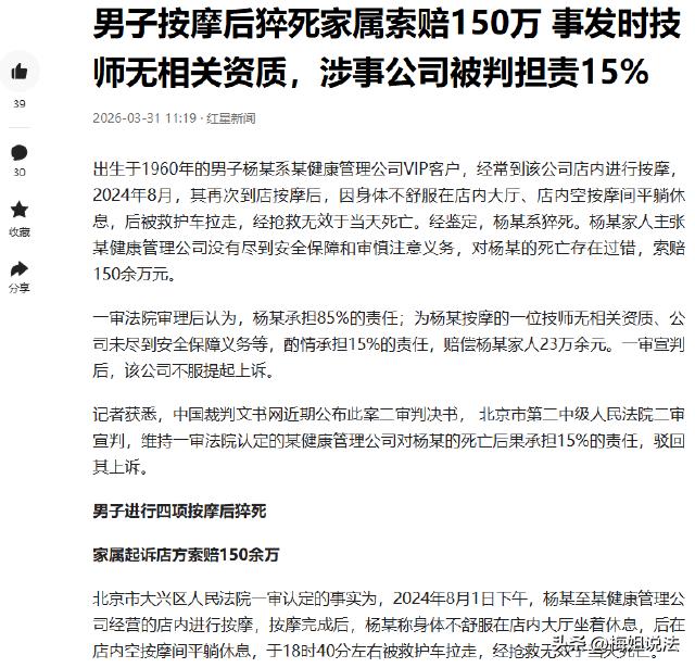 北京,64岁老杨去常去的按摩店做四项按摩,做完后身体不适,跟技师说拉肚子、冒虚汗、胸口闷。技师量血压发现异常,却没送医,只给水和吃的。老杨在大厅休息,不适加重,送医后没救过来,鉴定为猝死。家属无法接受,将店方告上法庭索赔150万余元。更让人震惊的是,法院查明店内技师事发时竟无相关资质! 说真的,这事看完,真能气到肝颤。 好好一个老人,去常去的地方放松一下,人怎么还就没了呢。 老杨今年64岁,平时就爱去这家按摩店,算是老主顾了,熟得不能再熟。 2024年8月1日下午,这一一次去,就成了最后的永别,他熟门熟路选了四项按摩,想着按完能舒服点,缓解一下身上的疲惫。 可刚按没一会,老杨就觉得不对劲,浑身发虚,还一个劲拉肚子,额头上的虚汗止不住往下淌,胸口更是闷得发慌,喘不上气。 他没太当回事,以为是天太热,自己没休息好,扛一扛就过去了。 毕竟是老顾客,也没好意思麻烦技师,就硬撑着让技师继续。 现在想想,这一扛,就错过了最佳的抢救时间。 按摩结束后,老杨的难受劲不仅没缓解,反而更重了,他撑着身子,跟技师说了自己的情况,语气都带着虚弱。 技师也慌了,赶紧拿来血压计给老杨量了量,一看数值,直接懵了,明显异常得离谱。 更离谱的是,技师其实知道老杨以前做过心脏手术,却没当回事,既没打120,也没送老杨去附近的医院。 就只是给老杨倒了杯温水,拿了点吃的,让他在大厅的沙发上躺着休息,说歇会就好了。 这操作真让人不能理解,血压已经异常了,还知道人家有心脏病,居然敢让人家自己歇着,心也太大了吧。 老杨躺在大厅,胸口的闷痛越来越厉害,连说话的力气都没有了。 店里的员工看他情况不对,才把他扶到按摩间的床上,可这时候,老杨已经快撑不住了。 直到这时候,员工才真正慌了神,手忙脚乱地打了120急救电话,可一切都太晚了。 救护车赶到时,老杨已经意识模糊,送医后经全力抢救,最终还是没能留住他。 鉴定结果出来,是猝死。 这个结果,老杨的家属根本无法接受。 好好的人,出门去按摩,怎么就猝死了? 家属直接把这家按摩店告上了法庭,索赔150万余元。 庭审时,法院查明,当时给老杨服务的技师,压根就没有相关的从业资质。 也就是说,这个给老杨按摩、在他身体不适时做出错误处理的人,连上岗的资格都没有。 现在养生按摩店遍地都是,很多人都像老杨一样,图方便图熟悉就随便去,谁能想到,里面藏着这么多隐患。 而且这家店,明知道技师没有资质,还敢让其上岗,简直是草菅人命,妥妥的摆烂式经营。 按摩店技师无资质,还拖延送医,到底要承担什么责任,老杨的猝死,店方要负责吗? 娱乐场所等公共场所的管理人或者群众性活动的组织者,未尽到安全保障义务,造成他人损害的,应当承担侵权责任。 按摩店属于公共场所,老杨作为消费者,在店内接受服务时身体不适,店方有义务保障他的人身安全。 技师发现老杨血压异常,还知道他有心脏病,却不及时送医,明显是未尽到安全保障义务,这是妥妥的过错。 用人单位的工作人员因执行工作任务造成他人损害的,由用人单位承担侵权责任。 技师是按摩店的工作人员,给老杨提供按摩服务、处理他身体不适的行为,都是执行工作任务。 就算技师无资质,也是店方招聘不当、管理不善导致的,责任也该由店方承担。 技师无资质就上岗,本身就是违规操作。 按摩看似简单,实则需要专业知识,尤其是面对老人、有基础病史的人,没有资质很容易出问题。 店方放任无资质技师上岗,本身就存在重大过错。 老杨自己没重视身体不适,是不是也有责任呢? 老杨一开始没当回事,硬撑着,也耽误了一点时间,但这不能成为店方免责的理由。 毕竟技师已经发现血压异常,还知道他有心脏病,却没有采取正确的急救措施,这才是导致老杨错过最佳抢救时间、最终猝死的关键原因。 最终,法院判决,按摩店赔偿杨某家属23万余元。 这也给所有按摩店提了个醒,别想着钻空子,无资质技师上岗、不尽安全保障义务,迟早要承担法律责任,赔了钱还毁了口碑,得不偿失。 欢迎针对本案,说说你的看法,觉得23万赔偿合理吗?平时去按摩,你们会特意看技师资质吗? 信息来源于:红星新闻、 男子按摩后猝死 家属索赔150万