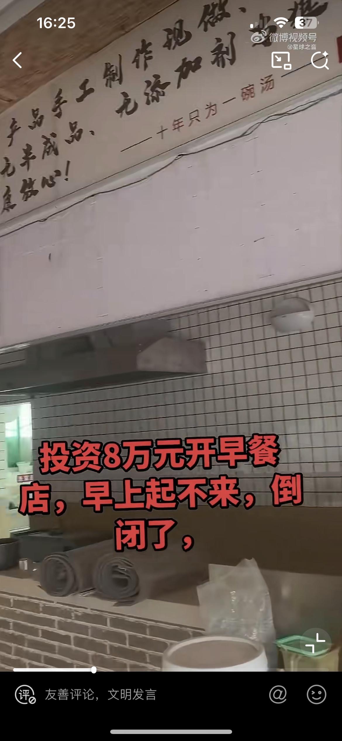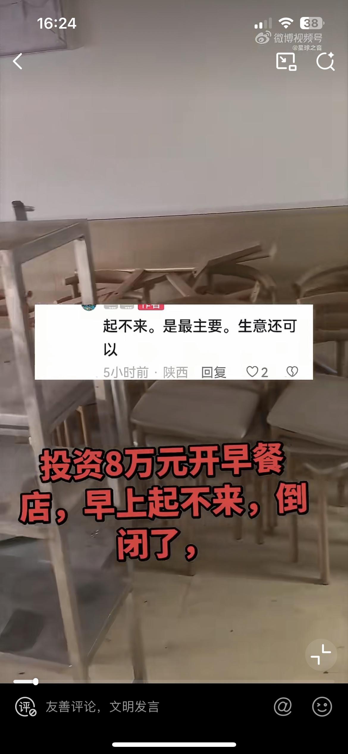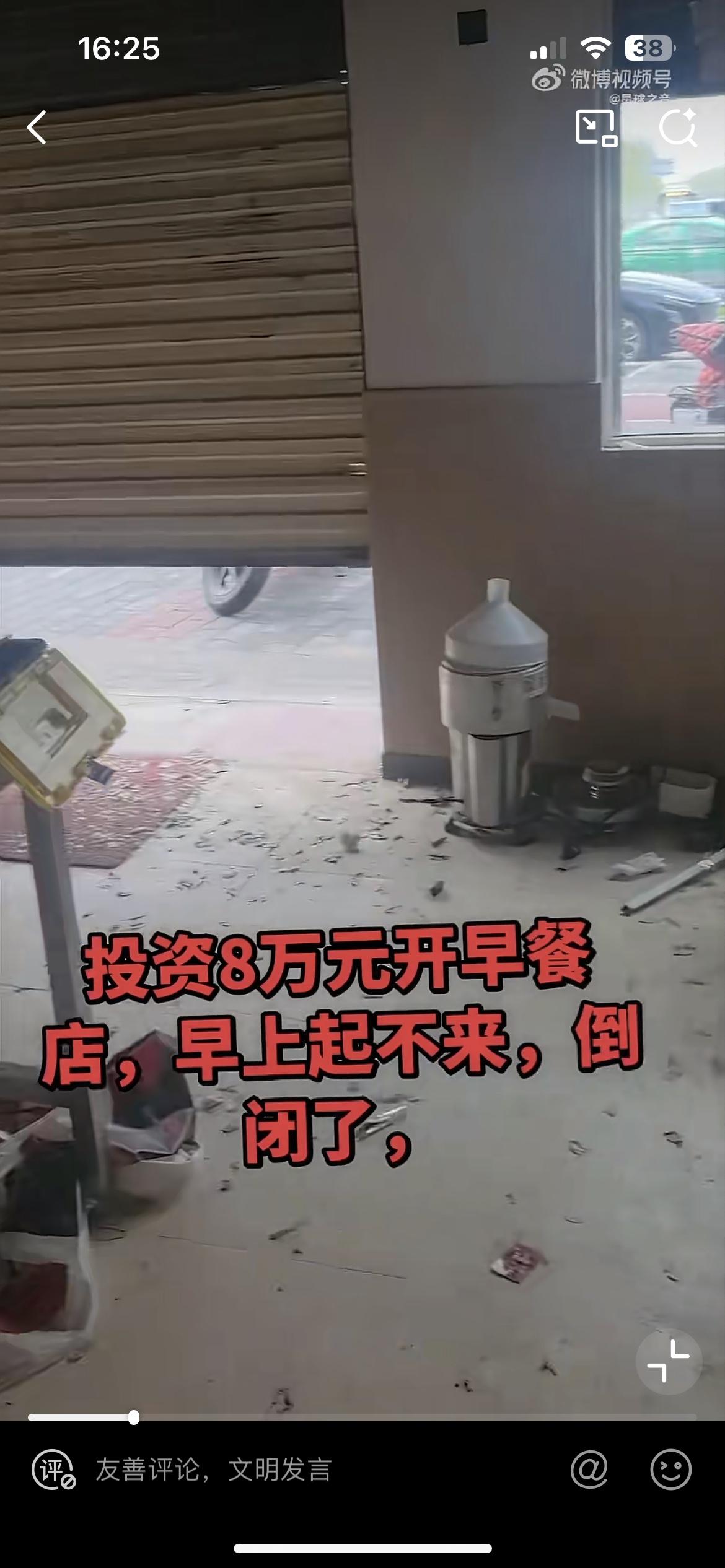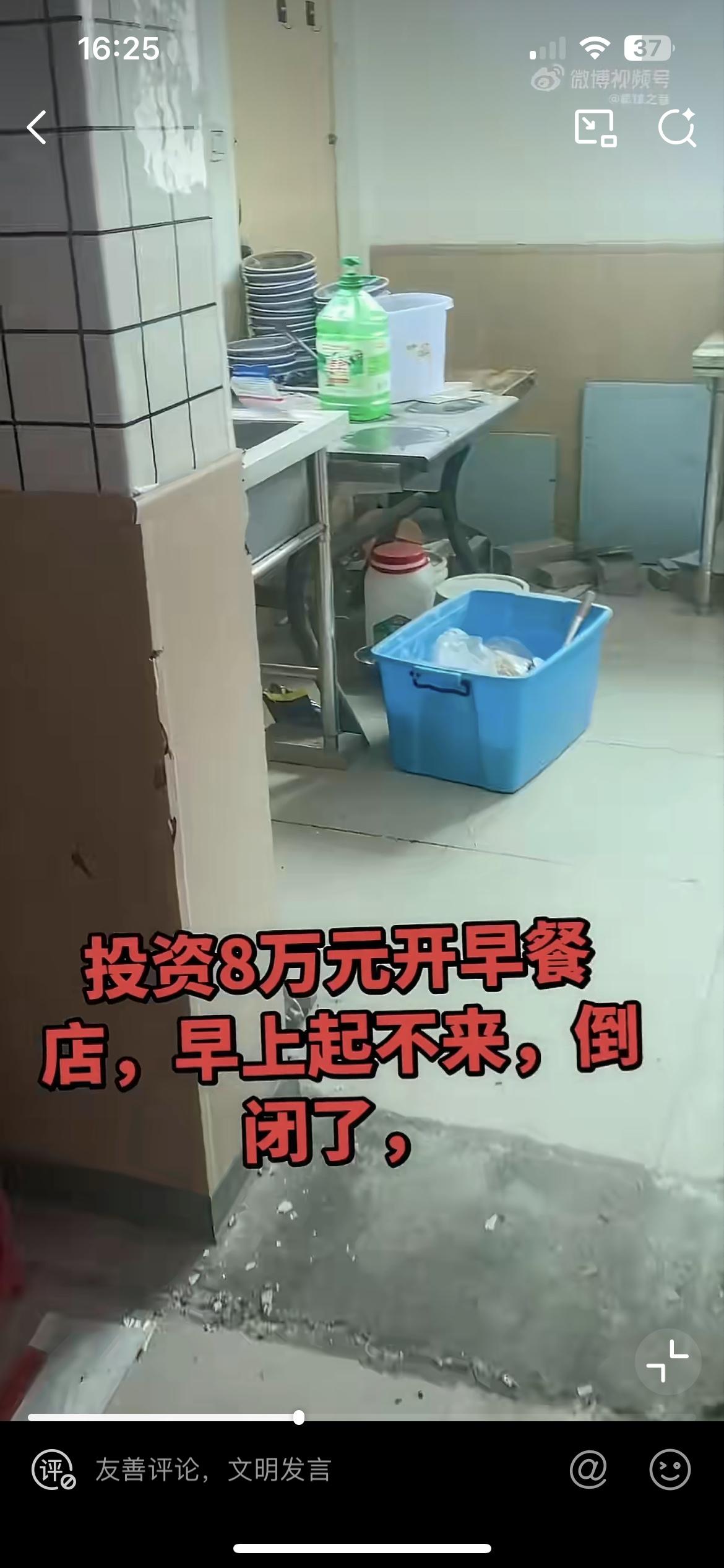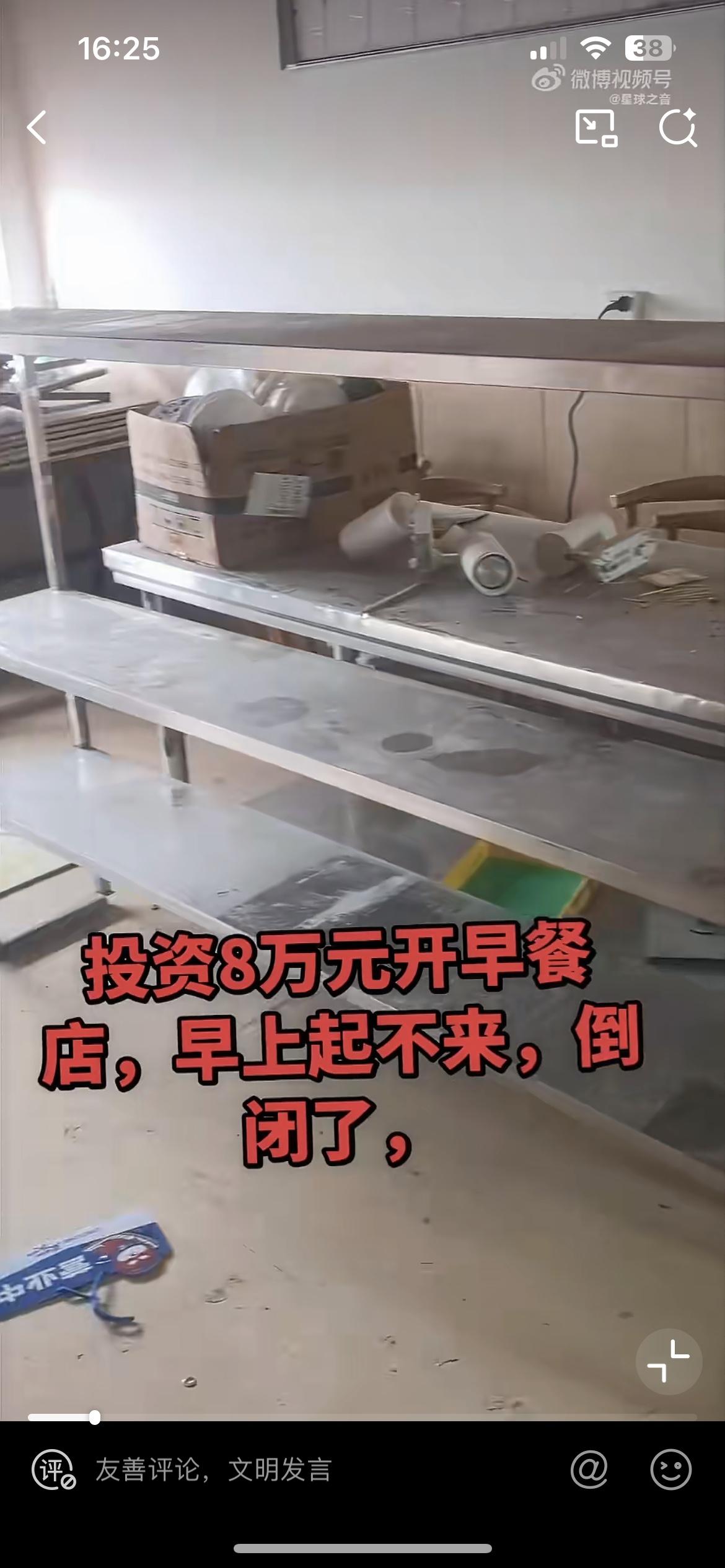 陕西投资 8 万的早餐店,3 个月亏完 10 万块,倒闭的原因很奇葩,主理人早晨起不来,爱睡懒觉。年轻人大学毕业,找不到工作。拿着父母的 8 万块出来创业,瞄准一个黄金地段开了个早餐店,花了 3 万的转让费,2 万块钱简单装修一下,剩下的 3 万买了各种厨房用具,锅碗瓢盆等等。头几天生意还可以,每天还有小赚,坚持了一段时间,这个年轻人顶不住了,偶尔早晨起不来,就没开门。想吃早餐的人一看没开门,以为不干了,时间一久就没人来吃了。年轻人索性摆烂,不到 3 个月亏完了 10 万块,所有的厨房用具打包卖给收二手厨具的,你们猜猜能卖多少钱?