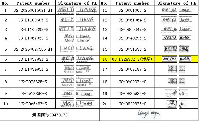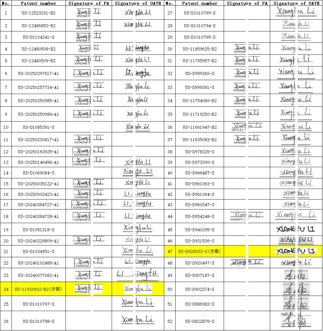 深圳市J素科技有限公司的美国涉诉专利数量,比中兴、联想、安克等知名大公司都多。J素公司是一家深耕小风扇赛道的跨境电商,频繁发起专利维权,根本不用诉讼进行到底,被告卖家纷纷和解求饶。 今天,我来终结一下J素公司的维权之路吧!就拿J素公司敲打深圳市F萨拉科技有限公司的25-cv-16605诉讼案来说吧,F萨拉公司应该这样应诉打掉TRO/PI禁令: 1、涉案专利US11920602B2和USD928932S1的申请过程中,3处Xiangfu Li签名存在明显不同。进一步的,原告拥有的另外50件专利涉及76处Xiangfu Li签名,存在更多明显不同版本。 2、涉案专利USD928932S1的申请过程中,涉及1处MEIYU LIANG签名;原告拥有的另外19件专利涉及19处MEIYU LIANG签名,存在多种明显不同的版本。进一步的,原告拥有的11类美国商标98479173(Jisulife)涉及1处MEIYU LIANG签名,与涉案专利USD928932S1签名存在明显不同。 3、涉案专利申请存在伪造签名行为,涉案专利申请存在根本性欺诈,违背《美国联邦法规》37 C.F.R.§1.4,涉案专利“自始无效”,原告没有合理的胜诉可能性,请求撤销初步禁令。 4、本案原告律师及原告提交的证据文件《2_25-cv-16605-CCC-LDW_1_Exhibit 4》第18页,同一页面竟出现另外3种不同于前述版本的MEIYU LIANG签名。原告律师明显知道并配合原告进行虚假陈述(含伪造签名),依据《美国法典》18 U.S.C.§1001,请求判处原告律师及原告罚款及拘禁。 我是知识产权嗨皮哥,引用或转发请注明出处!