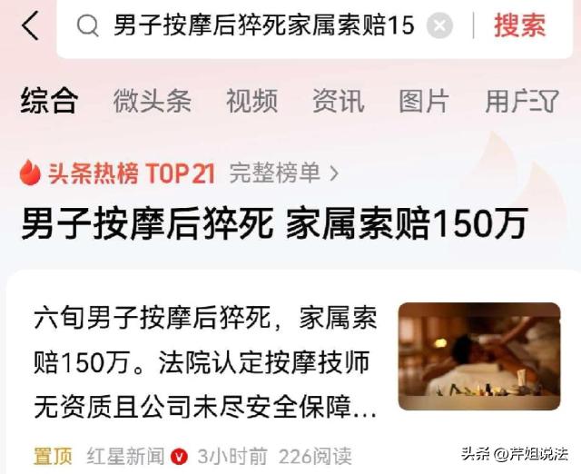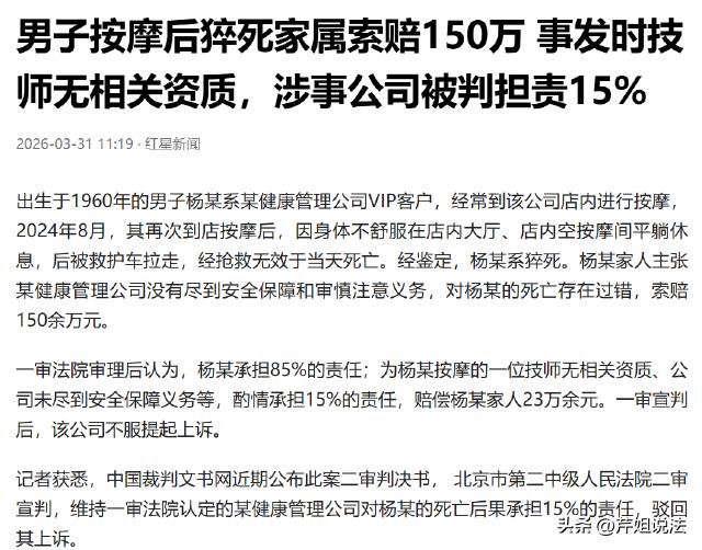 北京,60岁的杨某,在一家健康管理店按摩后,突发疾病离世。家属认为门店应该负责,于是起诉门店赔偿150万,可一审却判决杨某要承担85%的责任,门店承担15%。这究竟是什么原因? 杨某常年在一家健康管理门店按摩,是这里的老客户。 这天,杨某像往常一样到店按摩,当时门店的按摩师给他安排了四个项目,都是他常做的套餐。 不料,才刚按摩10分钟,杨某就感觉身体不对劲,一会冷一会热,还有点心悸胸闷,跟按摩师沟通了一下情况,按摩师也没有停下来,以为是正常的身体反应。 杨某也没太在意,毕竟这里经常来,还是老客户,应该没什么问题。 可意外就这么发生了。 杨某按摩完后,浑身冒冷汗,身体虚弱疲惫不堪。 随后,店里工作人员将杨某安排在一处空房间里休息,并倒了杯温水,拿了血压仪给杨某量血压。 杨某的种种迹象都表明,他很不对劲,可是工作人员没有察觉,只是按工作流程来进行服务。 杨某来这里开卡时,就明确登记了身体状况,之前有做过心脏手术,身体本身就和平常人不一样。 可即便如此,为杨某服务的工作人员也没有引起重视,只是让杨某躺下休息一会,还安慰杨某也许是按摩后的身体反应。 杨某也犯了一个致命的错误,明明当时意识清醒,知道身体不舒服,也没有主动要求就医。 杨某就这样躺了一个多小时,直到工作人员来叫他,发现人不对劲,立马拨打急救电话。 杨某最终在送医途中,经抢救无效离世了。 家属知晓后,痛不欲生,明明去按摩的时候人好好的,结果一去人就没了。 他们找到健康门店,指责他们的工作人员没有专业护理技能,没有正规的资质证书就敢上手给客户按摩;在杨某不舒服时没有停下按摩,也没有提前告知风;在杨某犯病时没有做到及时的救援,才导致悲剧发生,要求对方赔偿150万。 门店自然不认账,直言他们这里不是医院,有不舒服应该及时就医,不应该来店里按摩。工作人员全程都是按照店里的服务标准和流程操作,并无过错。 双方争执不下,杨某家属起诉至法庭。 一审判决结果如下:杨某自身承担85%的责任,按摩店承担15%的责任,赔偿家属23万余元。 门店不服,继续上诉,二审维持原判。 看到这里,肯定有人会疑惑,为什么人是在店里没的,店方才赔23万?这不是明摆着偏袒店方吗? 其实不然。 根据《民法典》第1173条 被侵权人对同一损害的发生或者扩大有过错的,可以减轻侵权人的责任。 60岁的杨某之前做过心脏手术,自己的身体状况自己最清楚。在按摩过程中,明知道身体不适,却没有选择告知家人或及时就医,反而放之任之,是要承担主要责任的。 按摩店是有错,但不是导致杨某离世的直接原因。 《民法典》第1198条,宾馆、商场、银行、车站、机场、体育场馆、娱乐场所等经营场所、公共场所的经营者、管理者或者群众性活动的组织者,未尽到安全保障义务,造成他人损害的,应当承担侵权责任。 也就是说,按摩店作为一家正规开店营业的门店,理当对自己的工作人员、服务质量进行严格把控。 安排给杨某按摩的技师,当时属于无证上岗,这属于门店没有尽到人员监管的责任。 再者,明知道杨某有心脏手术的历史,在其发病之时,没有做到及时的关怀送医,也要承担法律责任。 总而言之,杨某的事件,大部分责任还是在杨某自身,所以承担85%的责任,而门店一样要支付剩下15%的赔偿。 这件事也给我们提了一个醒,如若身体不舒服,千万不要盲目去按摩,宁愿选择在家休养,或者就医,能确实保证自己的什么安全才是第一位。 对于此案件,你有什么看法? 男子按摩后猝死 家属索赔150万