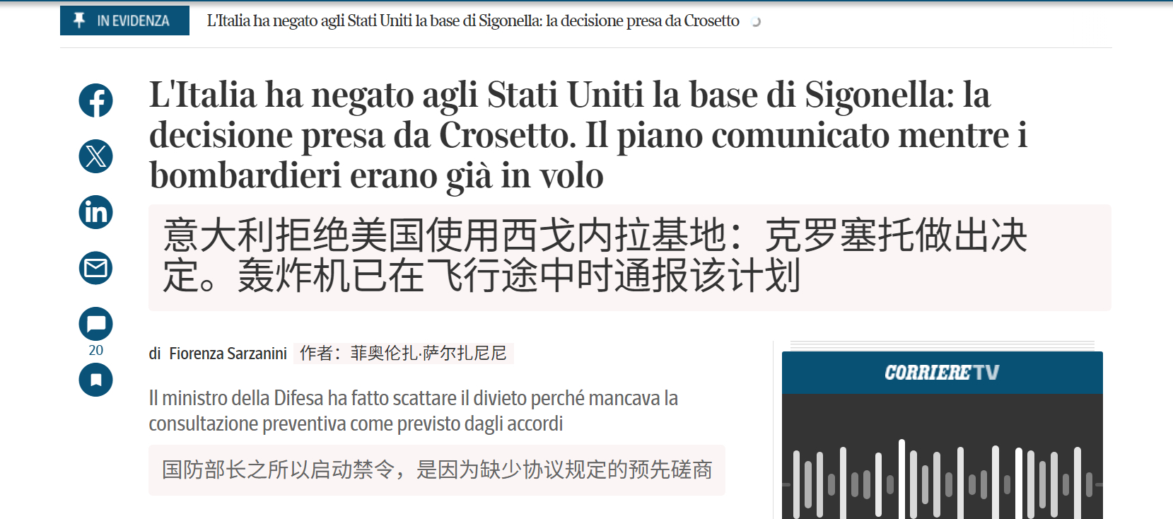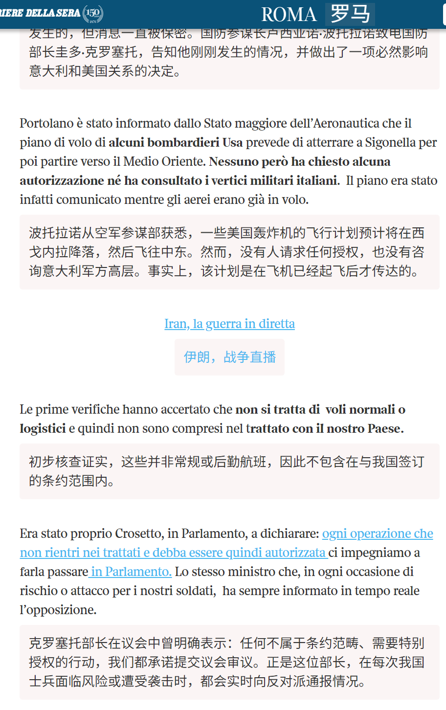 🔻据《晚邮报》报道,意大利拒绝允许美国军用飞机在西西里岛的一个基地降落,这些飞机正前往中东。🔻据报道,意大利给出的理由是:“从空军参谋部获悉,一些美国轰炸机的飞行计划预计将在西戈内拉降落,然后飞往中东。然而,没有人请求任何授权,也没有咨询意大利军方高层。事实上,该计划是在飞机已经起飞后才传达的。初步核查证实,这些飞行任务并非常规或后勤航班,因此不包含在与我国签订的条约范围内。这意味着它们需要正式批准和议会监督。”🔻意大利国防参谋长卢西亚诺·波尔塔拉诺根据意大利部长的直接指示,将决定告知了美军司令部:他们不能在锡戈内拉降落,因为他们未获授权,且事先未进行任何协商。因此禁令立即生效。考虑到可能引发外交危机的风险,就像 1985 年那样,当时意大利政府是克拉克西政府,美国总统是罗纳德·里根。伊朗最大岛屿遭美以袭击美军使用钻地弹袭击伊大型弹药库海外新鲜事中东现场直击