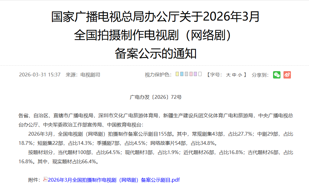 【正午阳光莫得闲备案】据国家广播电视总局办公厅关于2026年3月全国拍摄制作电视剧(网络剧)备案公示的通知,正午阳光(湖北)影视有限公司申报的网络故事片《莫得闲》备案,共3集,题材为近代革命剧。此前,电影《得闲谨制》由等主演,讲述一个桃花源般的小镇,一群因南京沦陷而逃难至此安居数年的百姓,偶有一日数名日军误入此地,百姓被日军逼到绝境后奋起直面迎战。一场双方武器相差悬殊的战斗,一次智慧与意志的比拼,就此展开。