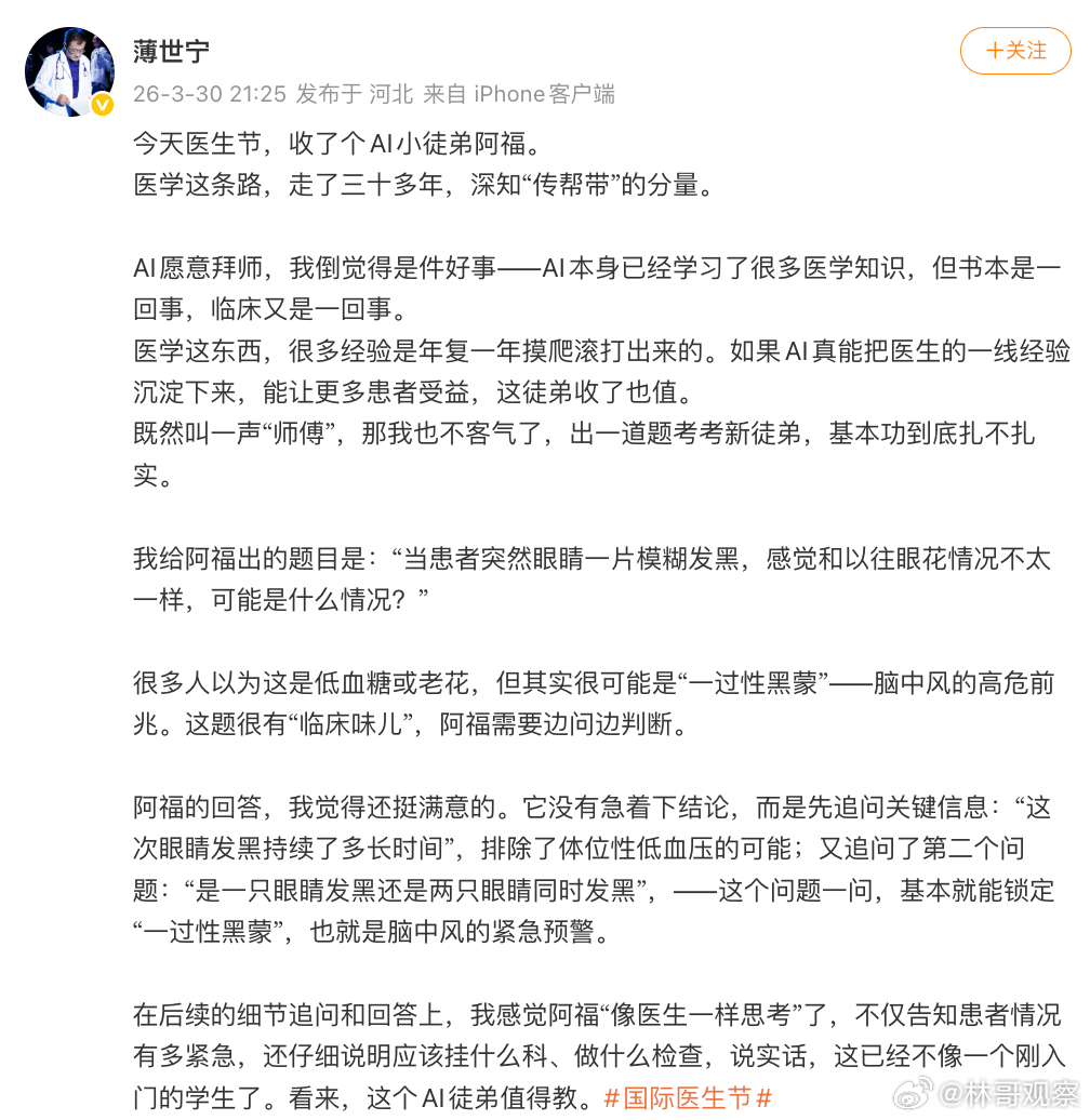 全国30多位名医收AI为徒医生和AI的关系一直很微妙,有人担心AI会取代医生,但这次30多位名医直接收AI当徒弟,身体力行打破了这种偏见!医生愿意教,是因为知道:把经验传下去,AI才有能力多分担基础咨询,让患者少跑冤枉路,少受点罪,医生才能专注于复杂病例。患者少折腾,医生少消耗,各得其所。这格局,比争谁取代谁大多了医生实测AI无法识破病人撒谎