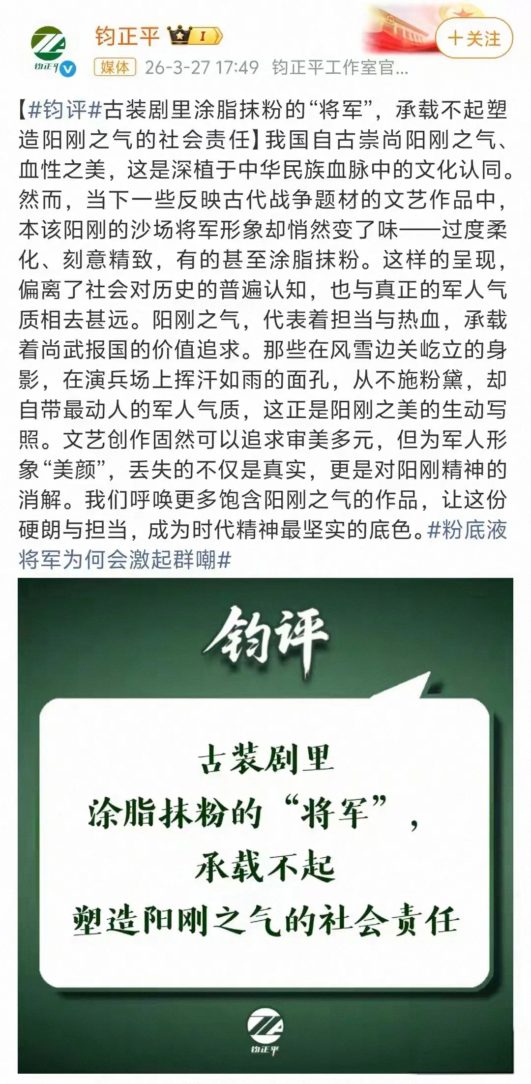 钧正平对“粉底液将军”现象的评论,是从维护军人形象、倡导阳刚精神的官方立场出发,其严肃性和权威性远超普通的娱乐讨论。饭圈粉丝冲击钧正平账号事件,性质非常严重,这相当于在公开质疑、挑战军方官方媒体的权威发声。