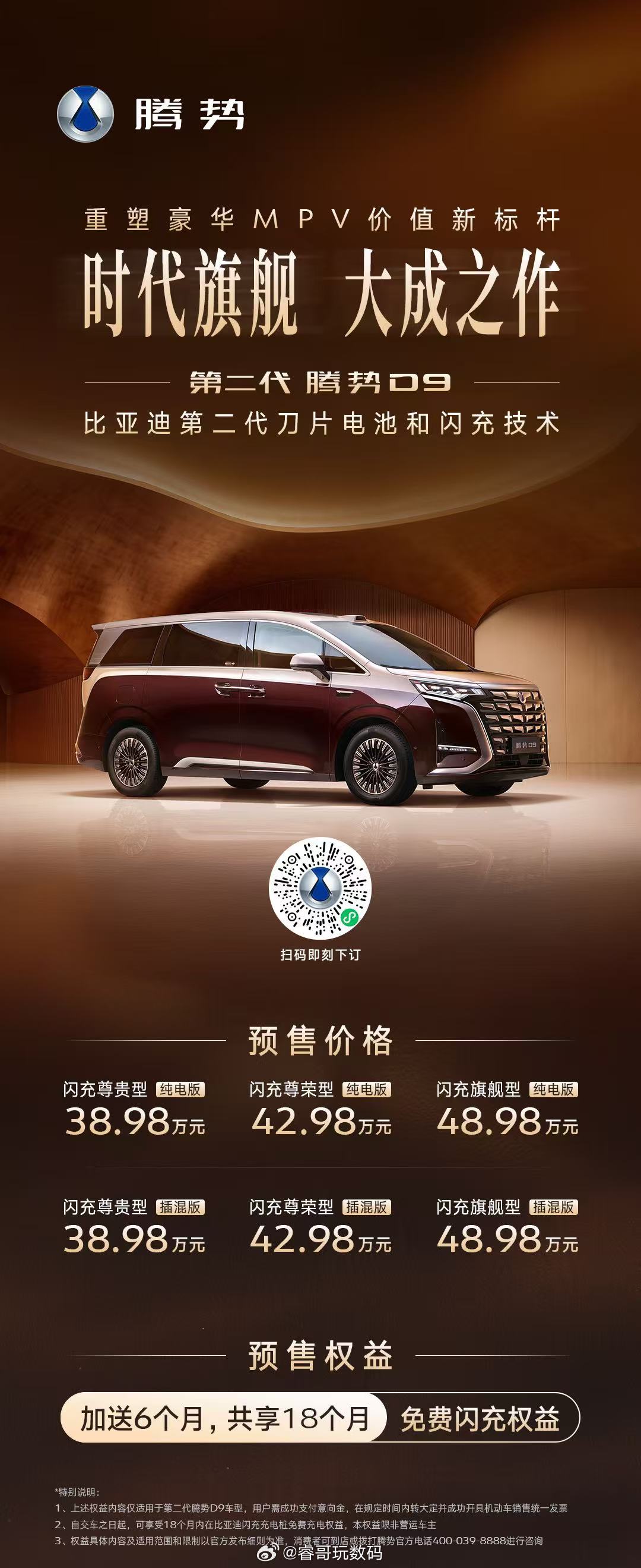 作为连续三年的MPV年度销冠,腾势D9还是全球首款销量突破30万辆的新能源MPV。此次预售仅揭晓了部分亮点,底盘、悬架、智能座舱等更多升级细节,将在上市发布会上正式公布。第二代腾势D9预售价38.98万起