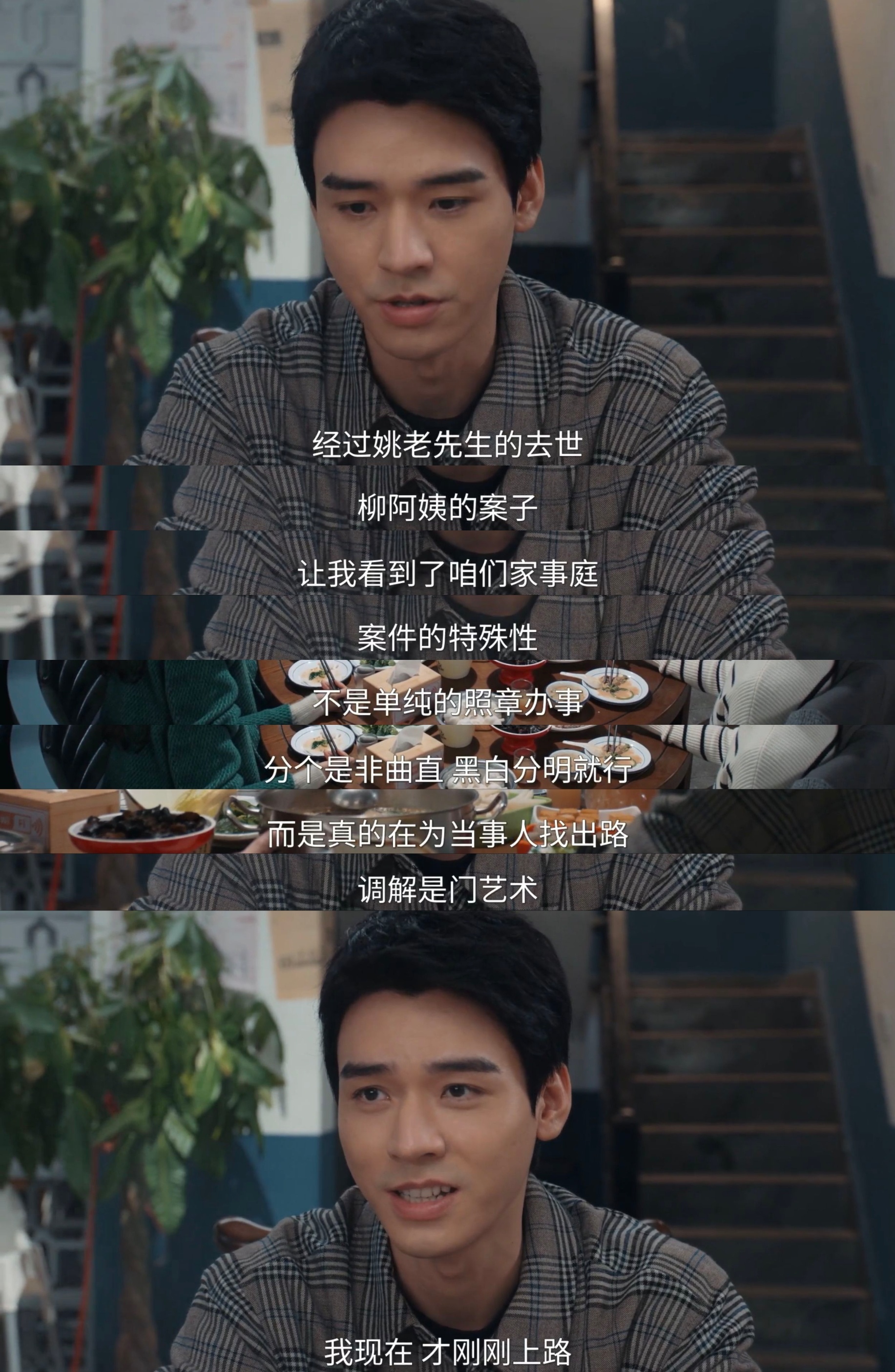 在柳阿姨的案子之后,这种变化继续进行,他接受并坦陈“家事庭,不是单纯的照章办事,是真的在为当事人找出路”“调解是门艺术,我现在才刚刚上路”,这种法与情的变化,也给予沈谢秩更多的活人感,他不再冷冰冰,会开玩笑,也开始与自己的父亲尝试对话。