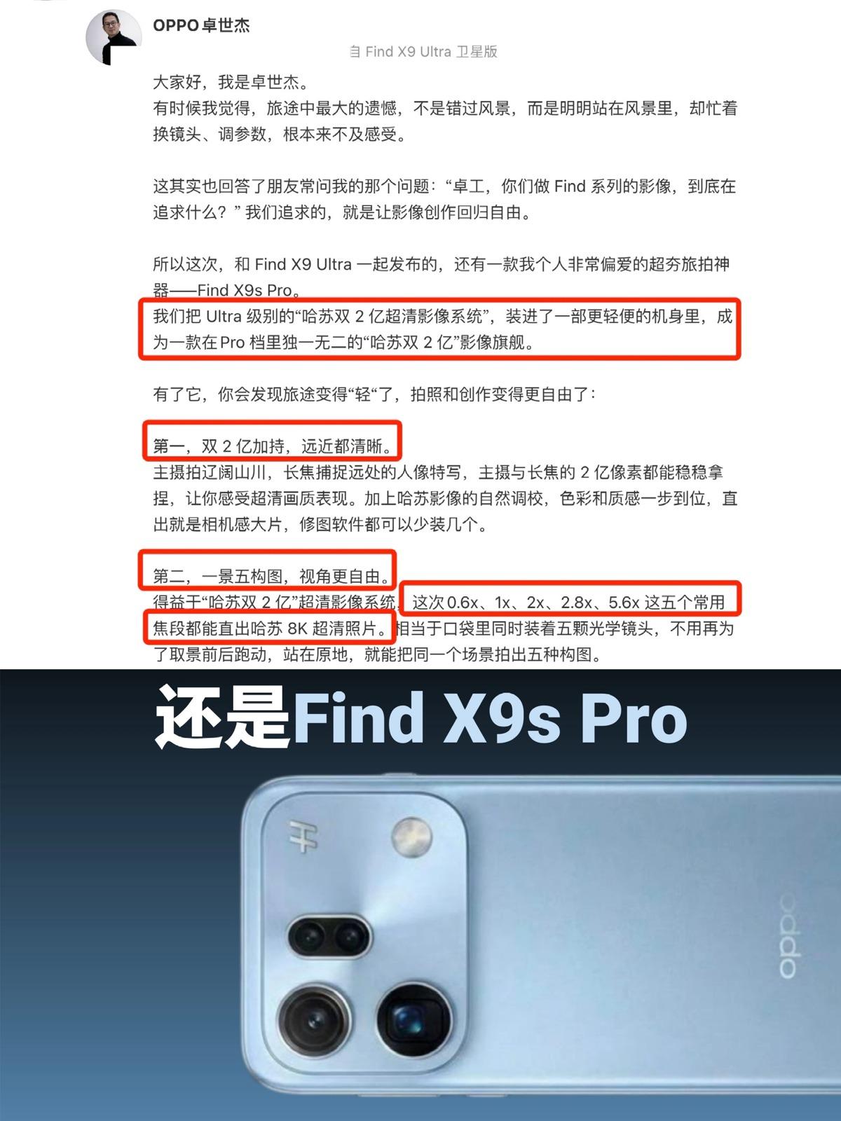 五一请4休11!坐等旅拍神器带出门浪🌊 嘻嘻,四月才到我已经在疯狂规划五一假期了! 请4天直接休11天,这波操作直接把快乐拉满 必须安排一场说走就走的旅行✈️ 已经在偷偷看机票和攻略了 恨不得下一秒就拉上行李箱出发! - 旅游前还得换台拍照超强的手机,记录旅途高光时刻~ 你说巧不巧! 我关注的OPPO新旗舰发布会刚好定档4月21日 五一前到手,时间完美衔接! 带着新手机去旅行,光是想想就无限期待了! - 现在唯一纠结的是选哪台…😭 一开始看中了📱OPPO Find X9 Ultra 内置增距镜的10倍光变太香了 但刚官宣的Find X9s Pro看着也很不错啊❌ OPPO高管都说了是Ultra级影像 直接给上了双哈苏2亿像素! 1x-5.6x随手拍都出片,构图自由到飞起! 尤其是这个2亿长焦 拉近看小姐姐的眼睫毛的都根根分明,贼清晰 - 而且看了对比友商Ultra 2亿像素实拍(图2) 感觉X9s Pro一点不输,是我的错觉吗? 放大后Find X9s Pro依然清晰,而且皮肤质感看着还贼好....... - 旅拍党最在意的续航也得提 一天暴走下来拍照导航刷视频,没电真的会谢! 听说Find X9s Pro要上7000mAh? 🤔那也完全够用了 不知道会不会涨价啊~ 五一旅拍神器OPPO Find X9 Ultra