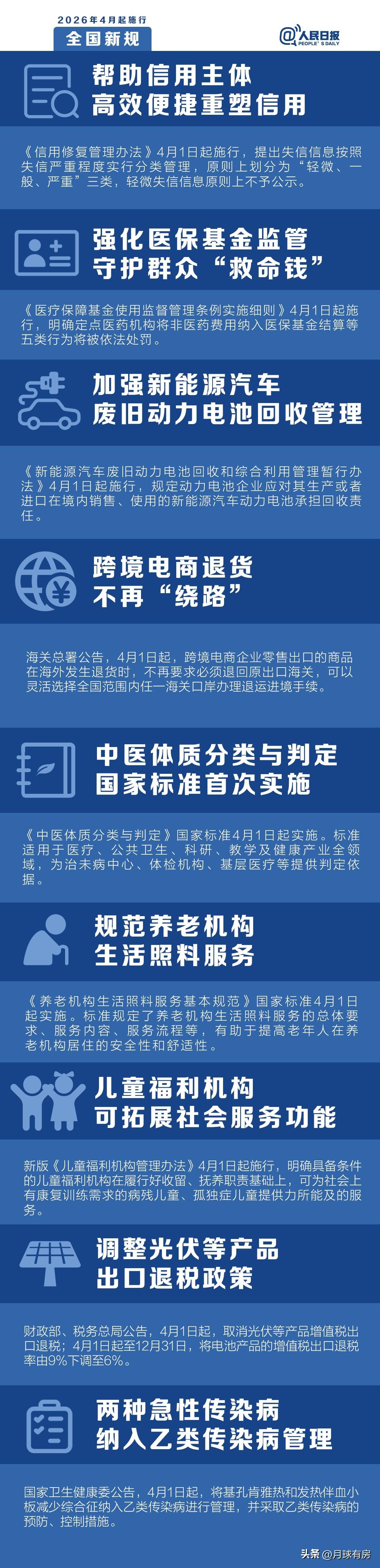 2026年4月,这些新规直接改变你的生活! 在社会里摸爬滚打这么多年,最清楚的一点是:国家的每一项新规,都藏着普通人的日子密码。 2026年4月1日起,从地方到全国,一连串新规落地,不管你是租房、买房、看病、还是做外贸,全都受影响。今天不绕弯子,直接把核心干货扒出来,让你一眼看懂。 先看地方新规,全是和老百姓生活息息相关的硬事。 北京直接把房屋安全的“第一责任”压给所有权人,以后房子出安全问题,业主得自己担责,日常检查、维修可不能再敷衍;天津入企检查全面“亮码亮证”,企业再也不怕乱检查、乱执法,还能打分评价,规范执法终于落地;河北把长护险和医保绑在一起,失能人员的护理保障有了着落,待遇不设起付线,算是给老年人吃了颗定心丸。 山西啃下煤矸石这块硬骨头,优先回填居民区、学校周边的矸石,生态环境终于能慢慢修复;内蒙古取消了重复收的水、电、气配套费,给企业减负的同时,也能稳住基建盘子;上海最关键,小区公共收益必须明明白白公示,只能用来补维修资金,再也不能被物业乱挪用,业主的钱终于守得住了。 湖南降低了业主议事门槛,不用再逼全体业主三分之二同意,片区、单元能单独决定物业事,效率直接拉满;广东管死了高层建筑消防,疏散通道、门禁系统必须时刻畅通,杜绝火灾隐患;海南更直接,举报非法彩票最高奖10万,谁都不敢随便搞歪门邪道。 再看全国性新规,这是关乎全国人的大动作。 信用修复终于分类管理了,轻微失信的人不用再被公示“一竿子打死”,给了重塑信用的机会;医保监管严打违规,非医药费用纳入结算等五类行为直接罚,“救命钱”再也守得住;新能源汽车动力电池回收责任压给企业,以后废旧电池再也不能乱丢弃,绿色循环有了硬约束。 跨境电商退货不用再绕原路,全国任一海关都能退,物流成本直接降了;中医体质分类判定国标首次实施,以后看病、体检有了统一标准;养老机构和儿童福利机构的服务规范也落地了,老人、孩子住得更安全、更舒服。 最关键的是外贸和传染病管理:光伏产品取消出口退税,电池退税率下调,外贸企业得提前调整策略;基孔肯雅热、发热伴血小板减少综合征纳入乙类管理,防控措施更精准,大家不用过度恐慌,但也不能掉以轻心。 2026年4月的新规,严的是违规、护的是民生、稳的是大局。 这些规则不是摆设,是实实在在改变你我生活的底线。记住这几点,不管是办事、做生意还是生活,都能少走弯路。