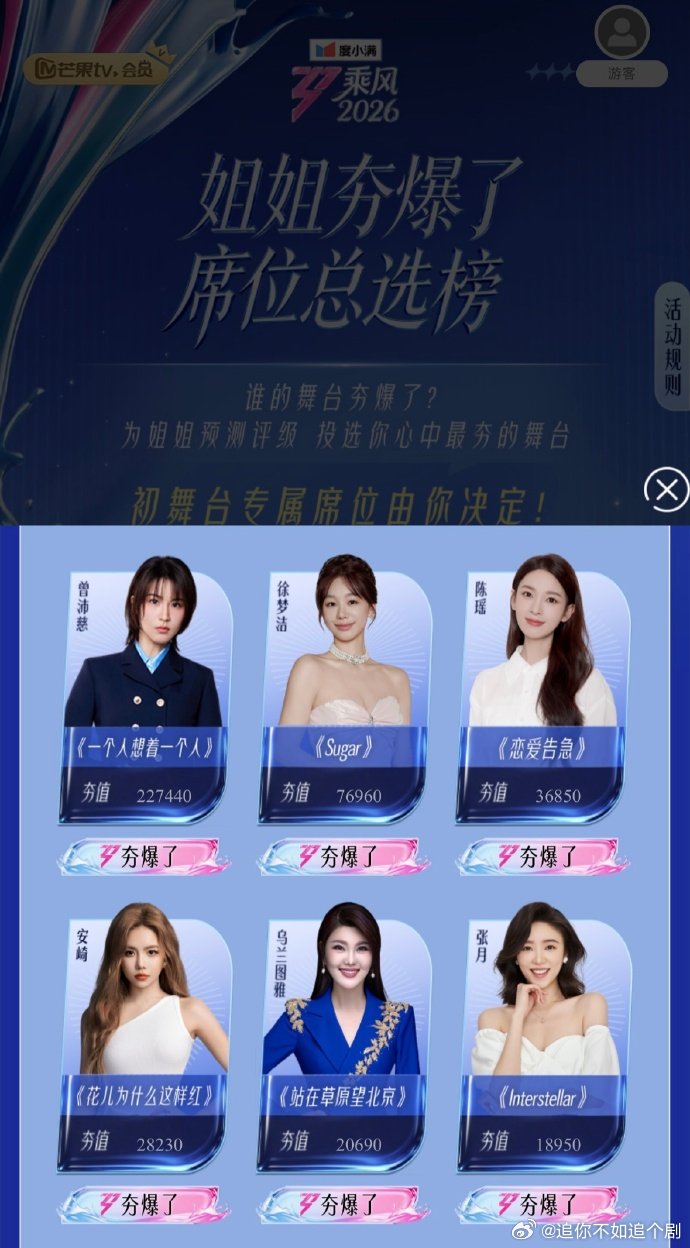 乌兰图雅人气浪姐还没播热度就这么高,乌兰图雅直接拿下第五,足以看出大家对她的期待值有多高。乘风2026