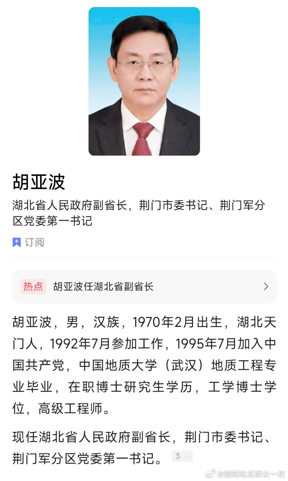 胡亚波任湖北省副省长。