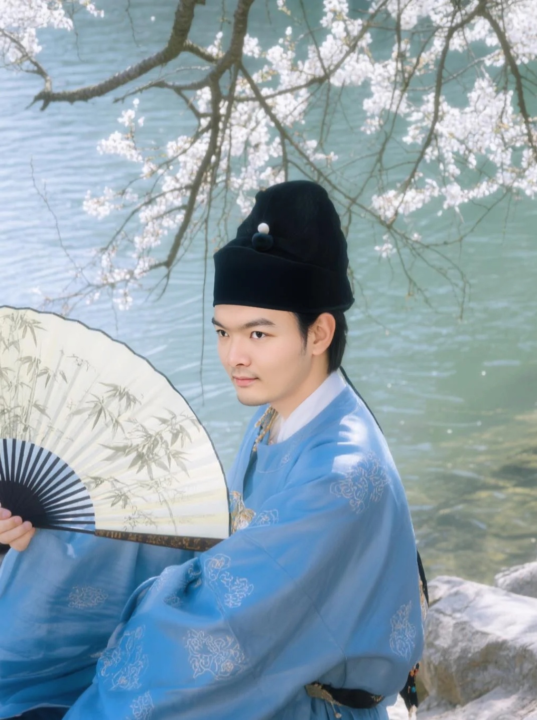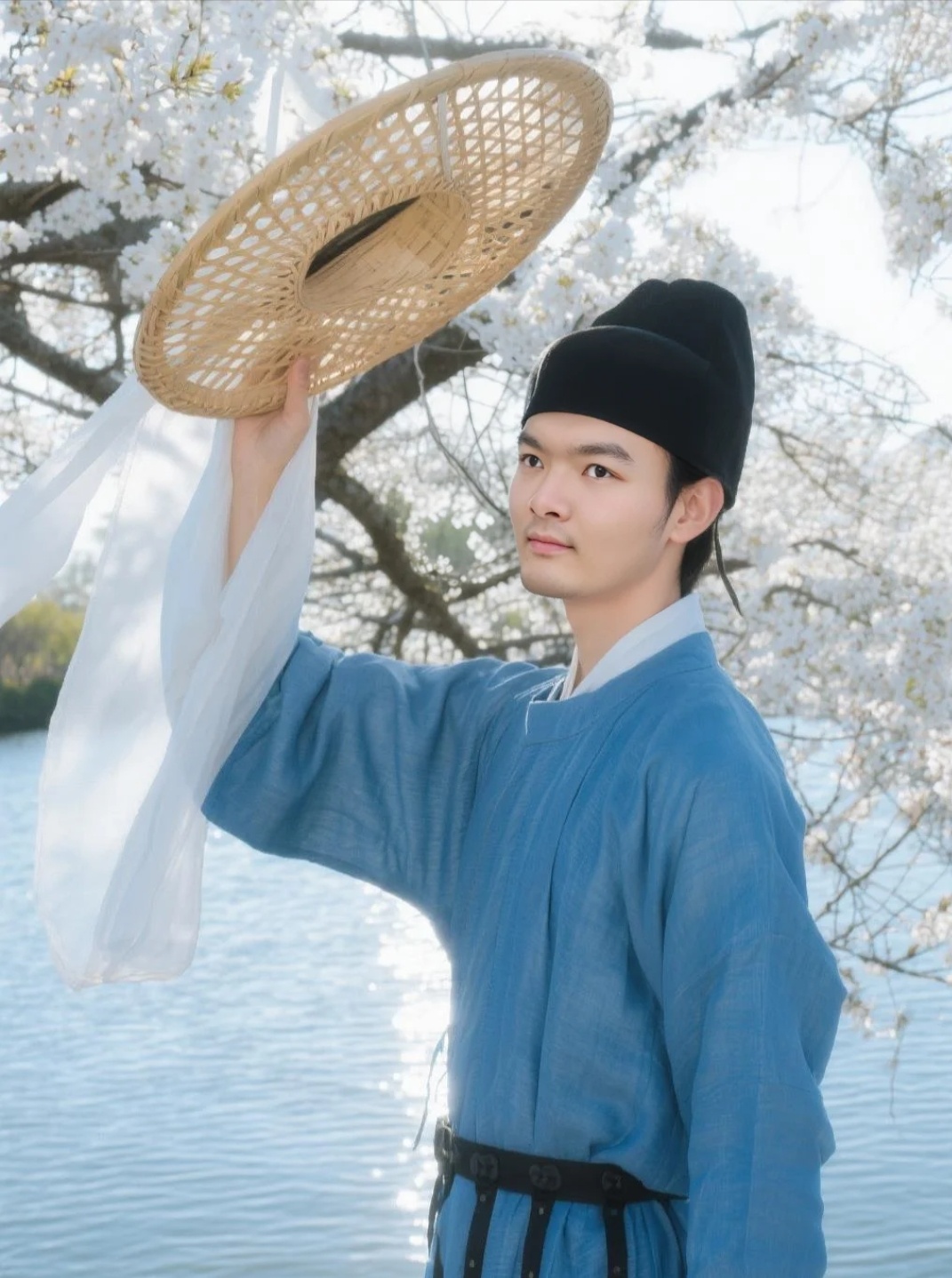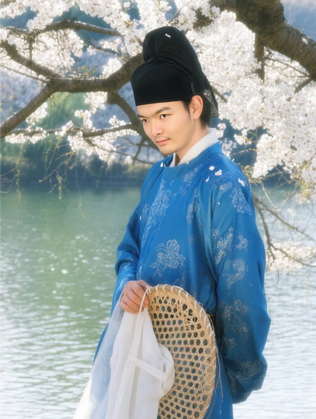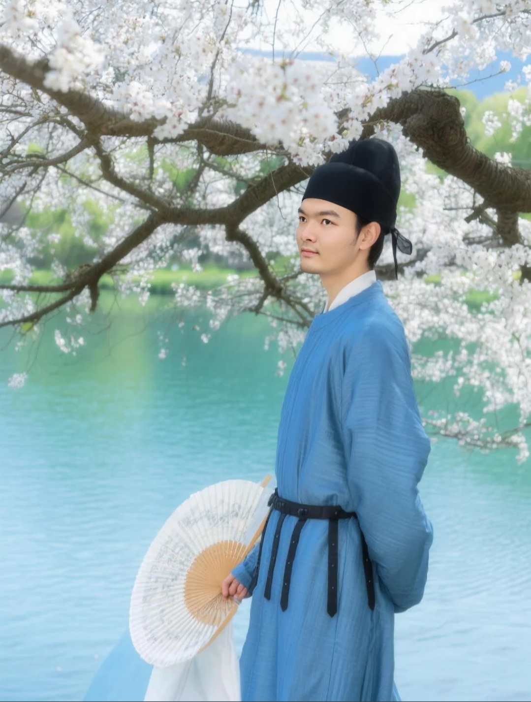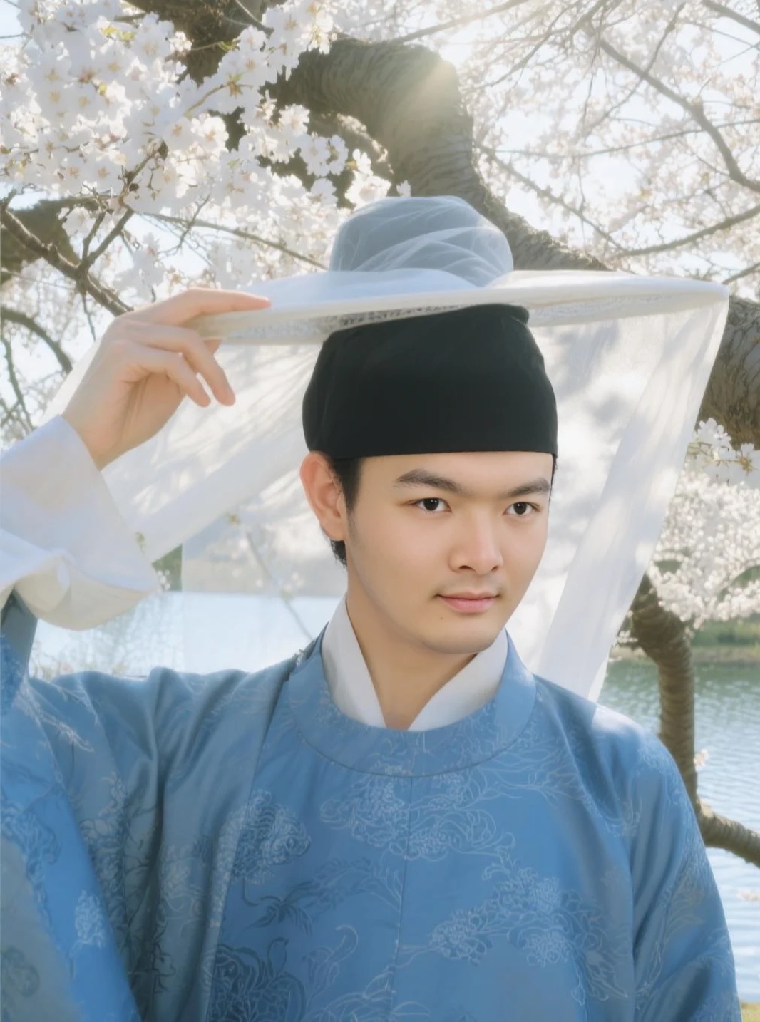 头戴幞头,手里或执扇、或提笠、或轻撩纱帽,站在樱花树下,湖水波光粼粼,花瓣飘在肩头——突然就懂了古人说的“人在花间走,如在画中游”。