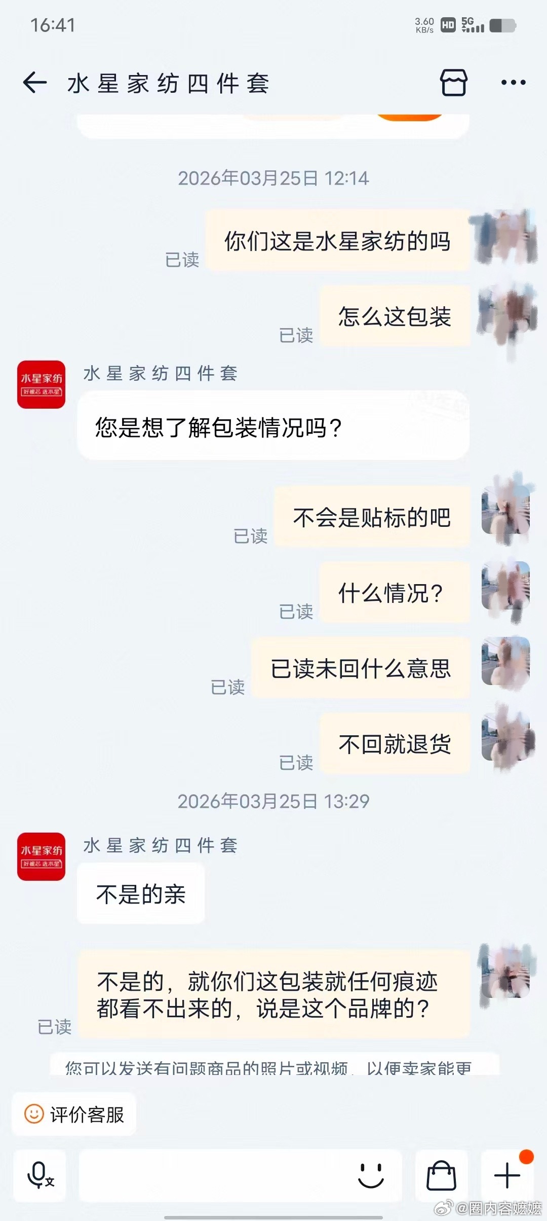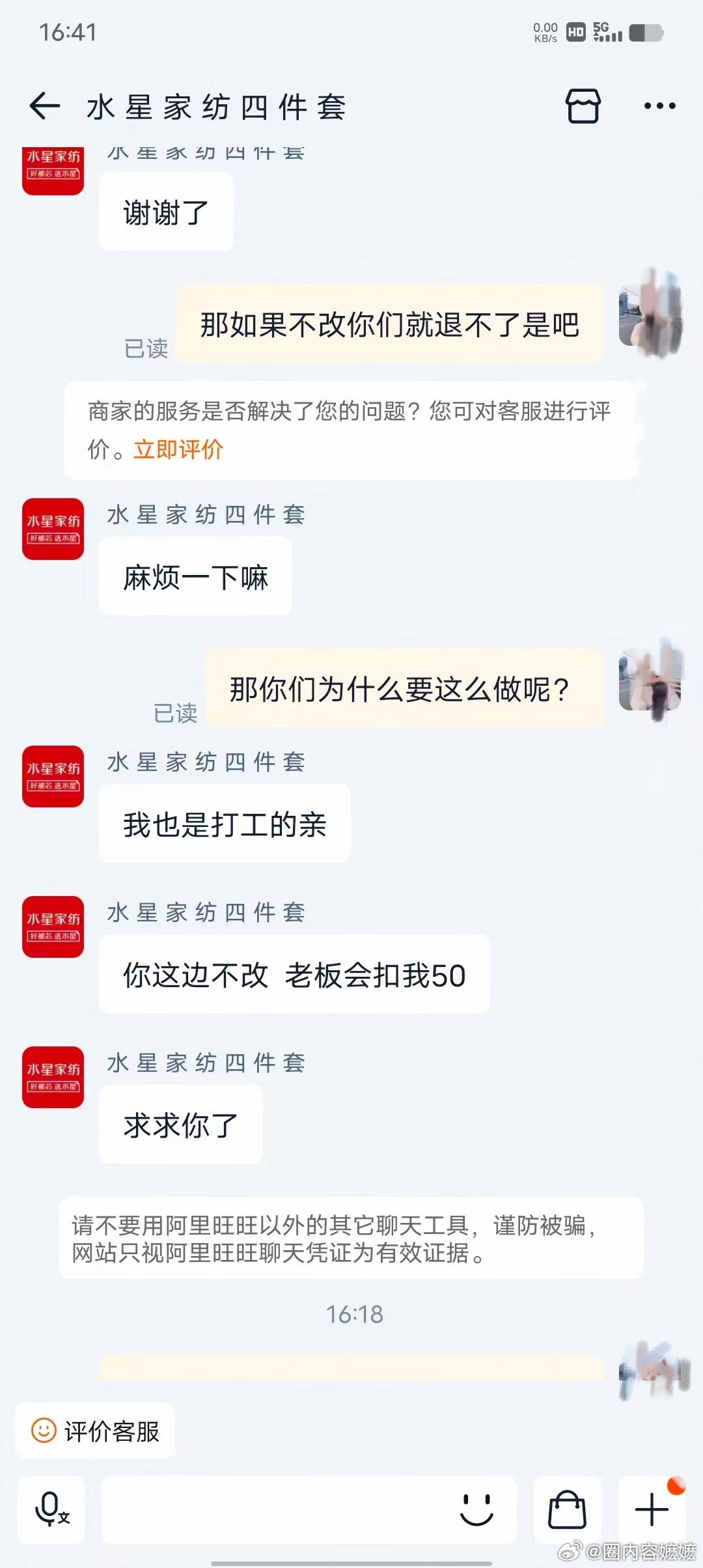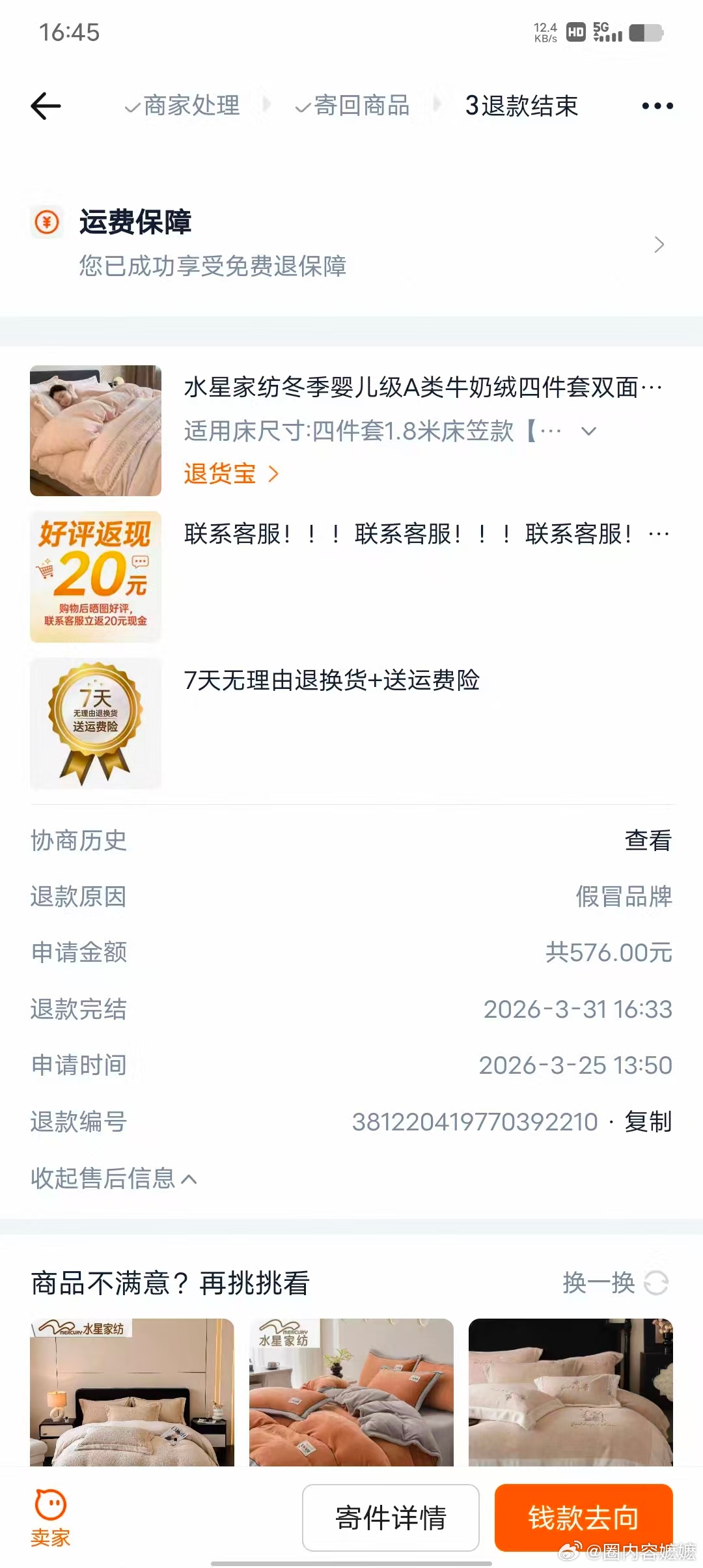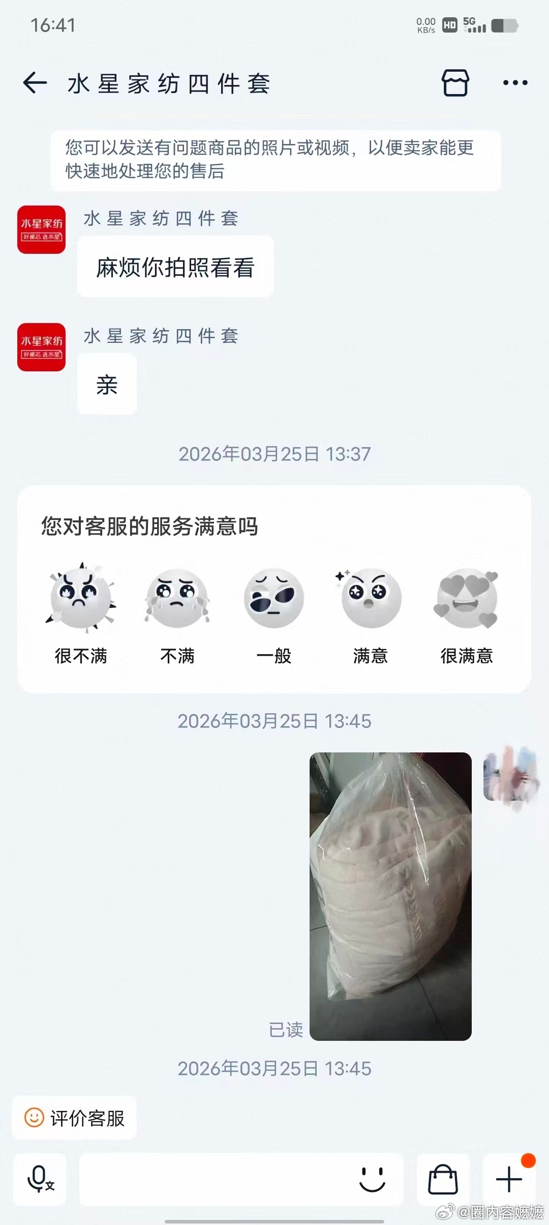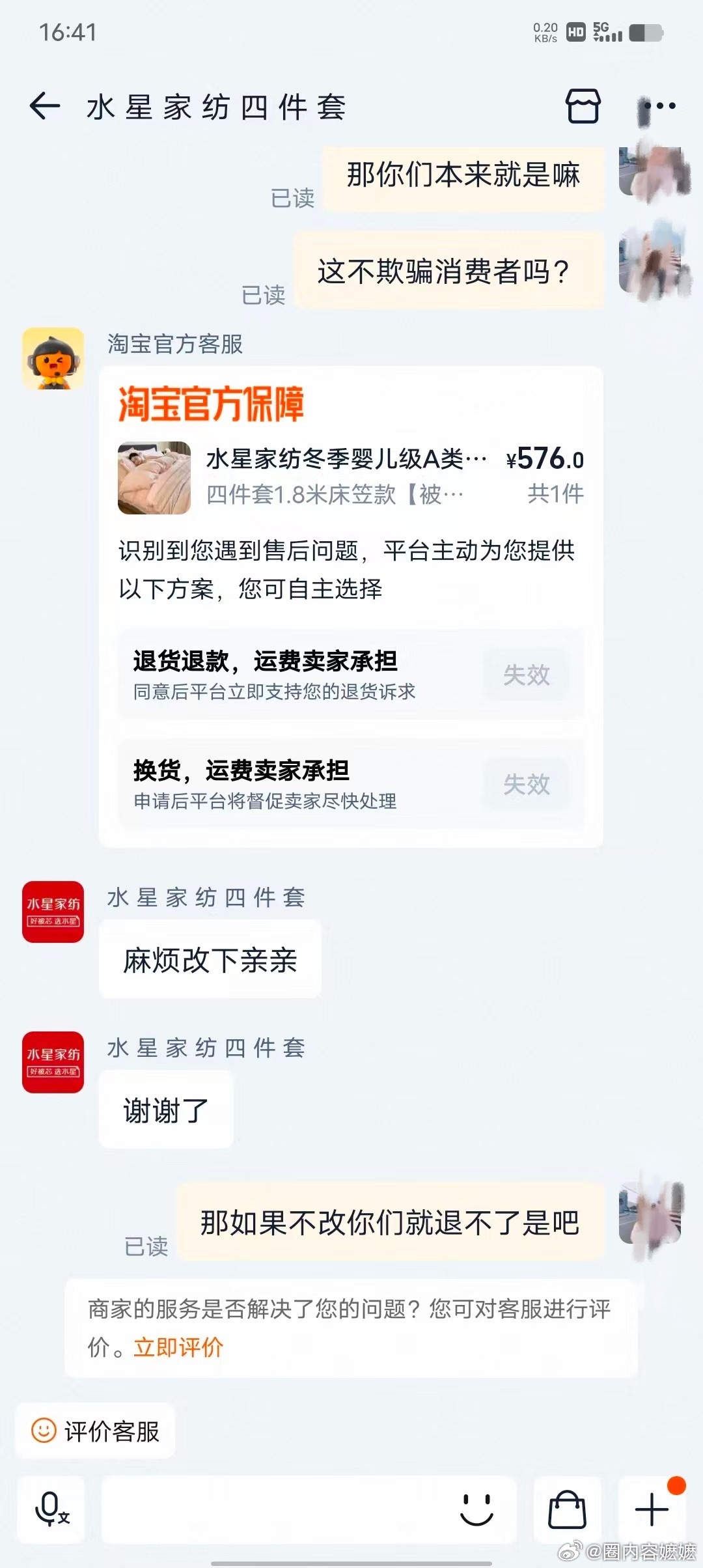 水星家纺 网友投稿:在淘宝水星家纺一个企业认证店铺买的四件套,货到了拆开发现货不对版。
