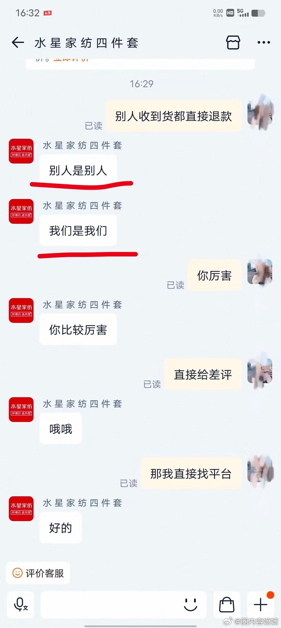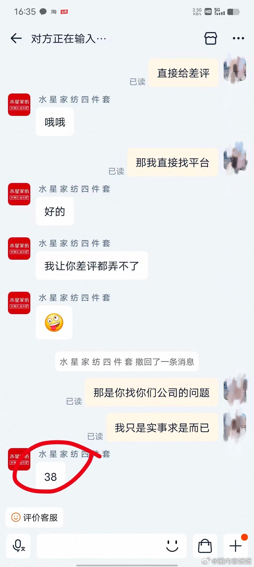 随后该消费者说要找平台介入给她差评,她不仅不退款还嚣张的说让你差评都评不了,还骂消费者38,请问一下水星家纺,这家店铺是你们授权经销商吗?这就是你们的服务态度嘛?