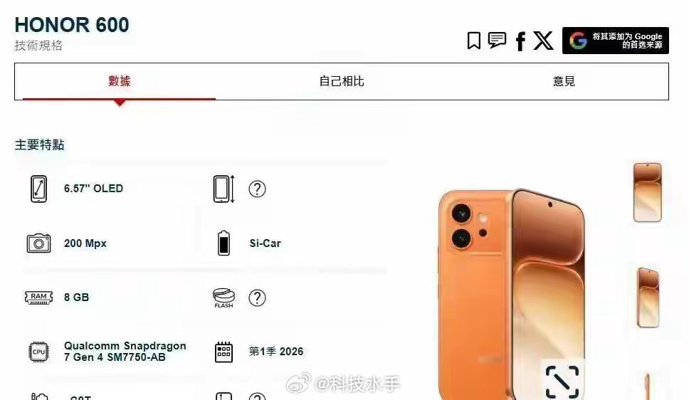 据海外消息,新机已经现身荣耀马来西亚官网,核心升级直接拉满:独立AI按键、影像大升级、AI大升级三大核心改动,直接给系列来了次彻底的设计大改。从渲染图来看,外观设计也迎来了全新迭代,大概率会延续荣耀400系列的海外先发节奏,先在海外发布再回归国内。这波不仅是配置升级,更是产品定位的全面拔高,已经开始期待600系列真机的实际表现了!数码资讯