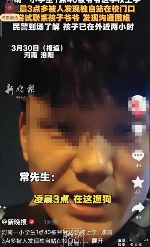 太离谱了!网友凌晨3点遛狗,校门口偶遇小女孩,询问后大吃一惊,原来她在凌晨1点半就被80岁的爷爷送来了,网友试图联系爷爷,但是沟通并不顺利,报警后,警察送女孩回到了家。 河南洛阳,常先生在凌晨3点的时候起床遛狗,结果走到小学附近,发现在清冷的街道上,竟然还有一个小女孩独自站在那里。 常先生赶紧走过去问一问,看看是什么情况。 原来女孩在凌晨1点半的时候就被爷爷送过来上学了,而她已经在这里独自等了两个小时左右,常先生询问女孩爷爷的手机号码,结果打过去之后,爷爷说话也糊里糊涂的,根本就没有办法正常交流。 最后没有办法,常先生只能选择报警处理,后来在警察的询问之下,才知道爷爷疑似患有阿尔兹海默症。 不得不说,父母心也太大了呀,让一个患有阿尔兹海默症的爷爷照顾一个小孩,而且还是一个小女孩,幸亏这是遇到好心人了,要不然真的不敢想。 有的网友感慨,,爷爷应该是阿尔兹海默症,分不清白天黑夜,要不能大半夜送孩子上学,幸亏孩子命大,没有遇到人贩子。 也有的网友吐槽,别的不说,这凌晨3点遛狗的大哥也是够神的。 还有当了妈妈的网友非常心疼小女孩,说自己的女孩每天上学的时候都恨不得她多睡1分钟是1分钟,结果凌晨把孩子丢在了外面,睡眠呢?安全呢? 一开始看到这个事情感觉很离谱,但是一想到80岁的老人还要送小孩,也真的是无话可说了,因为他是一个无可避免的社会问题,现在的社会,大部分的家庭都是老人带孩子上学,我中年人努力赚钱,养老的,养小的。