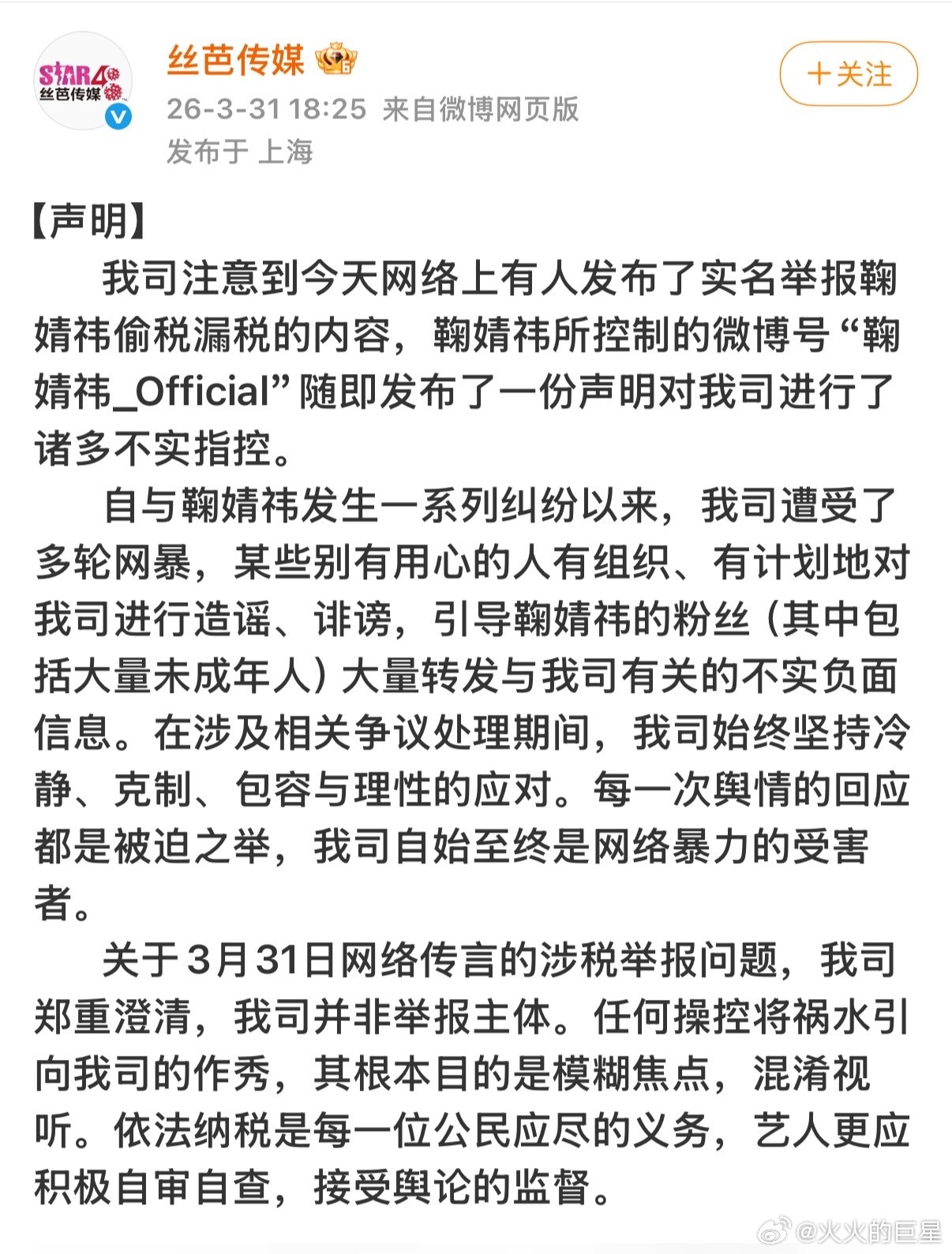 丝芭传媒发声明称没有举报鞠婧祎,并提出三连问: