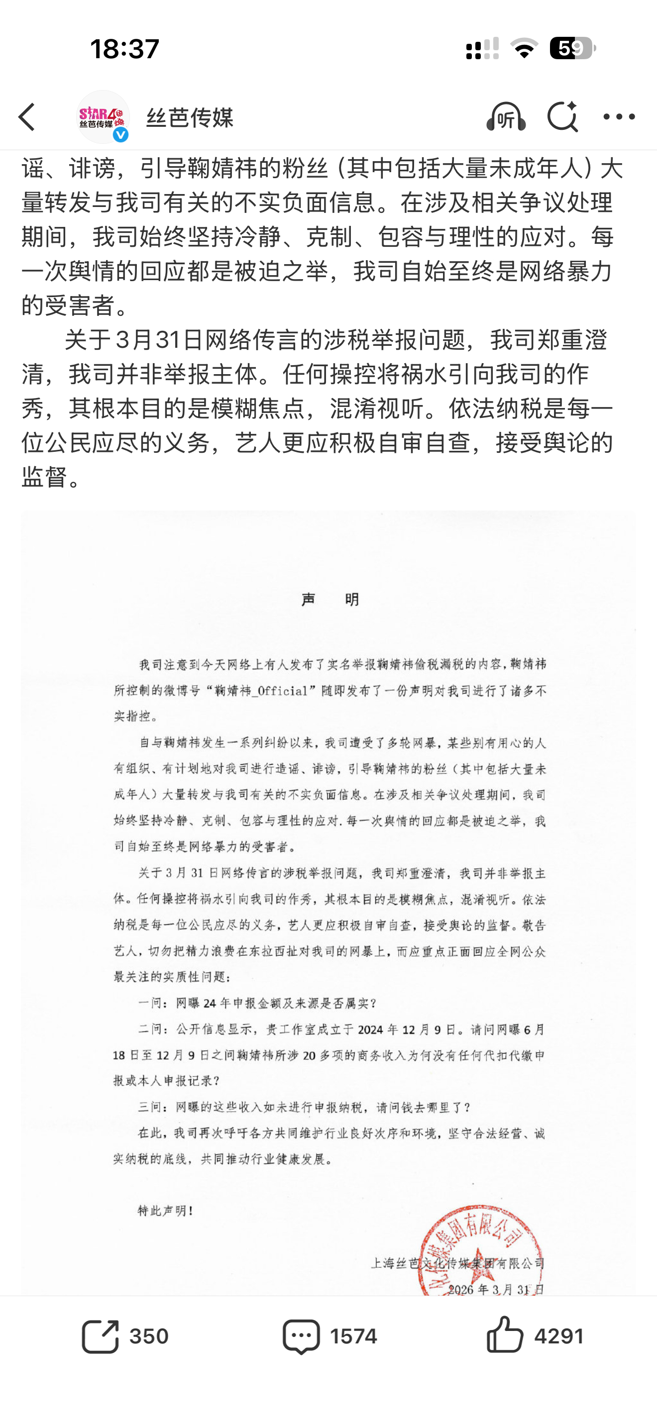 丝芭传媒没有举报鞠婧祎丝芭传媒称自己是受害者 刚刚,丝芭传媒发文称自己不是举报鞠