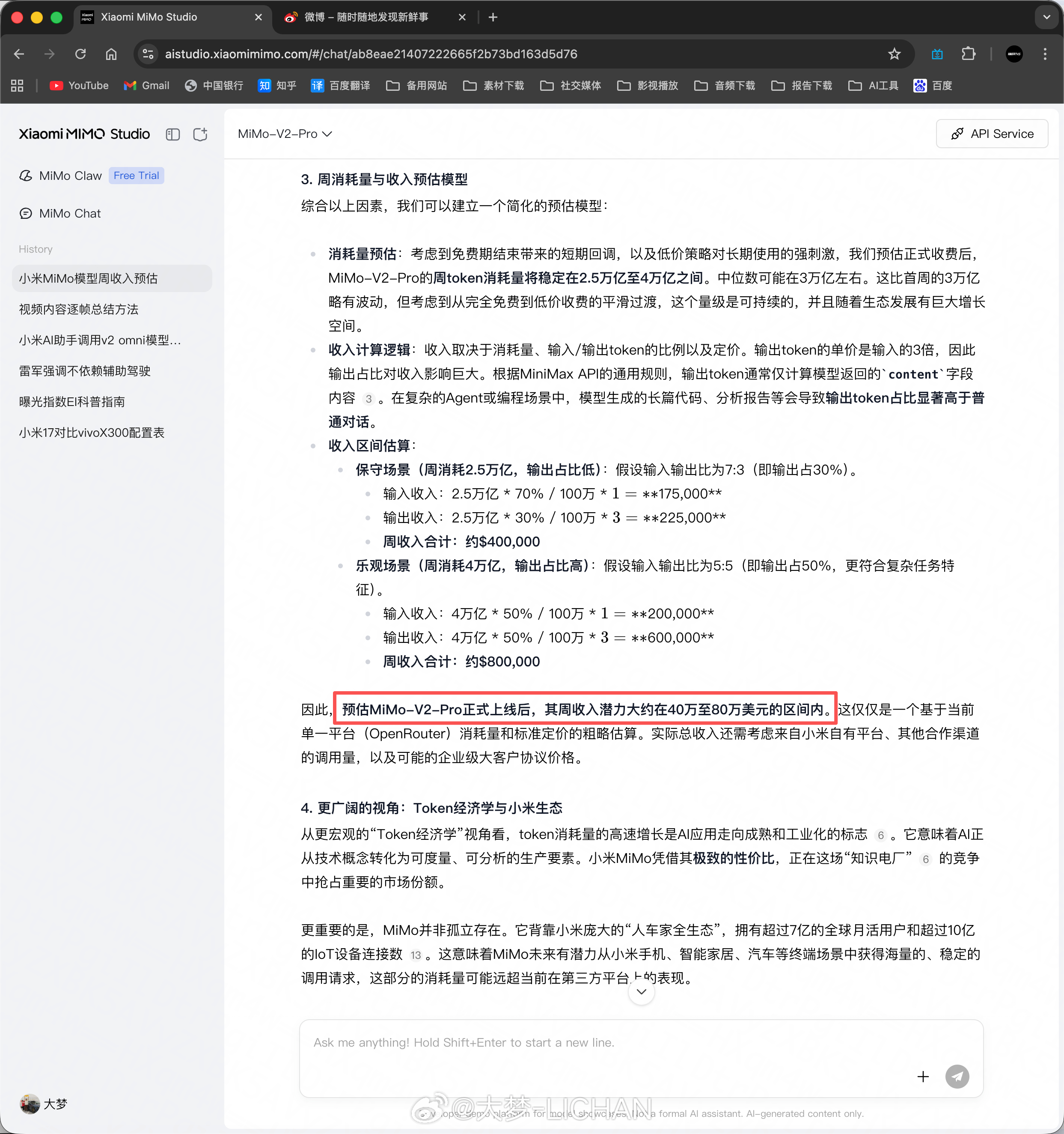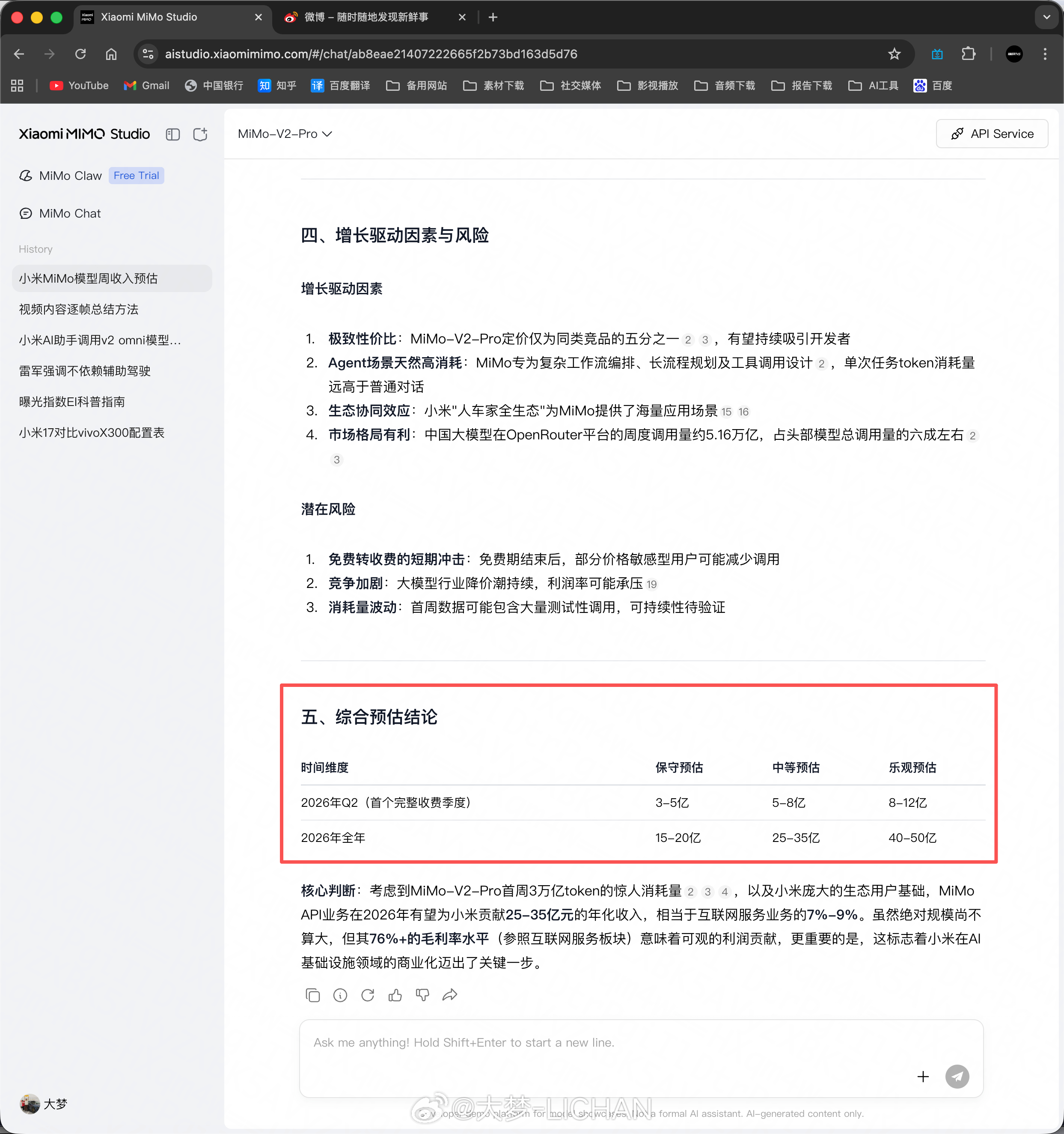 不过在这里需要注意的是,MiMo只是根据当前的情况粗略计算,一年可能会带来40~50亿的收入,没有考虑增长和未来的可能变化,实际情况我觉得可能会更好一些。