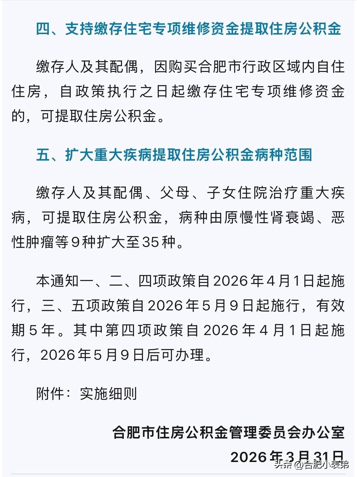 3月31日最新通知:公积金不仅能交物业费,还可用于城市更新住房改造、购房缴契税、缴存住宅专项维修资金,重大疾病提取病种范围也同步放宽! 钱终于能用在刀刃上,便民又实在,合肥这波太贴心了👍