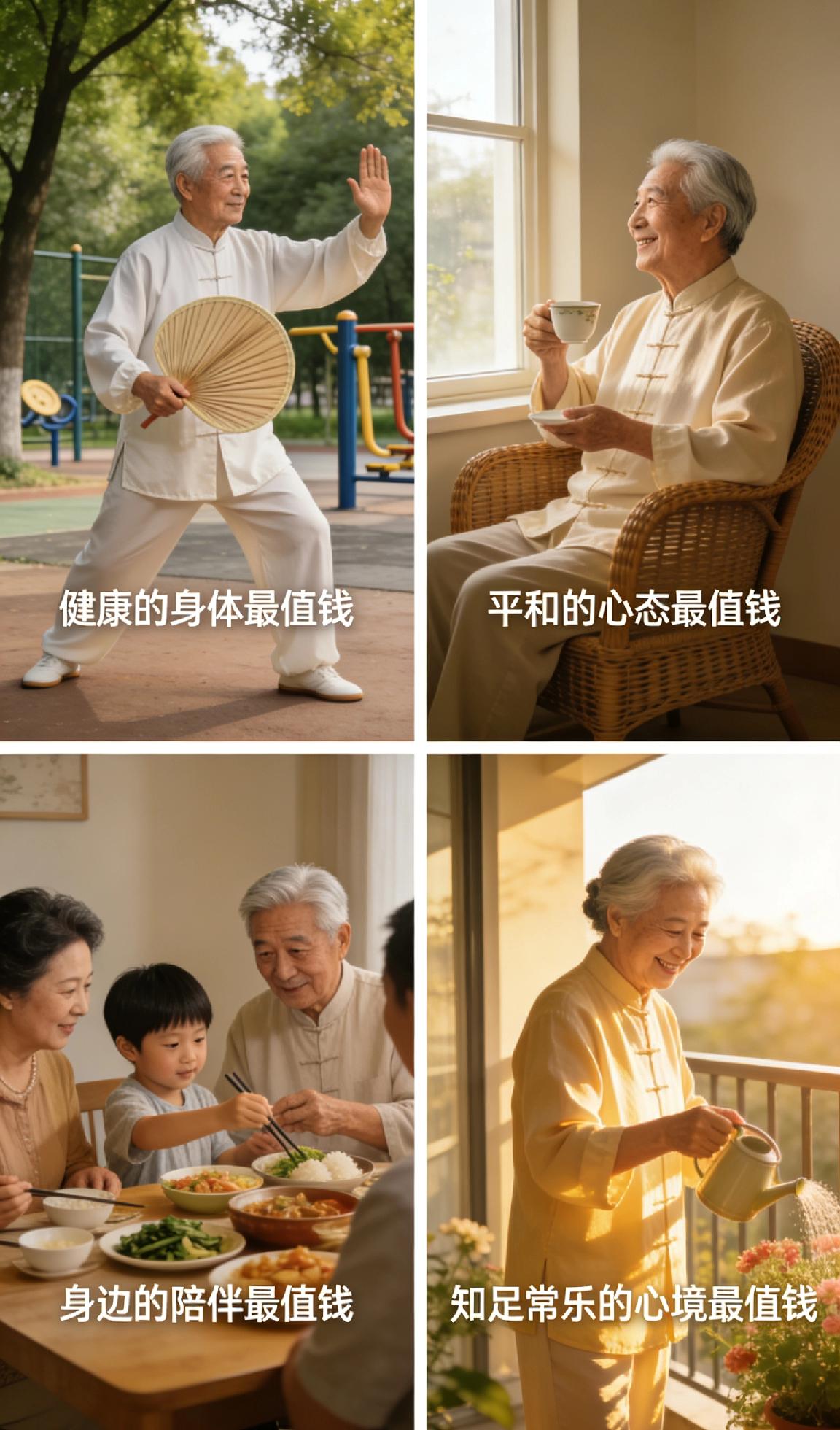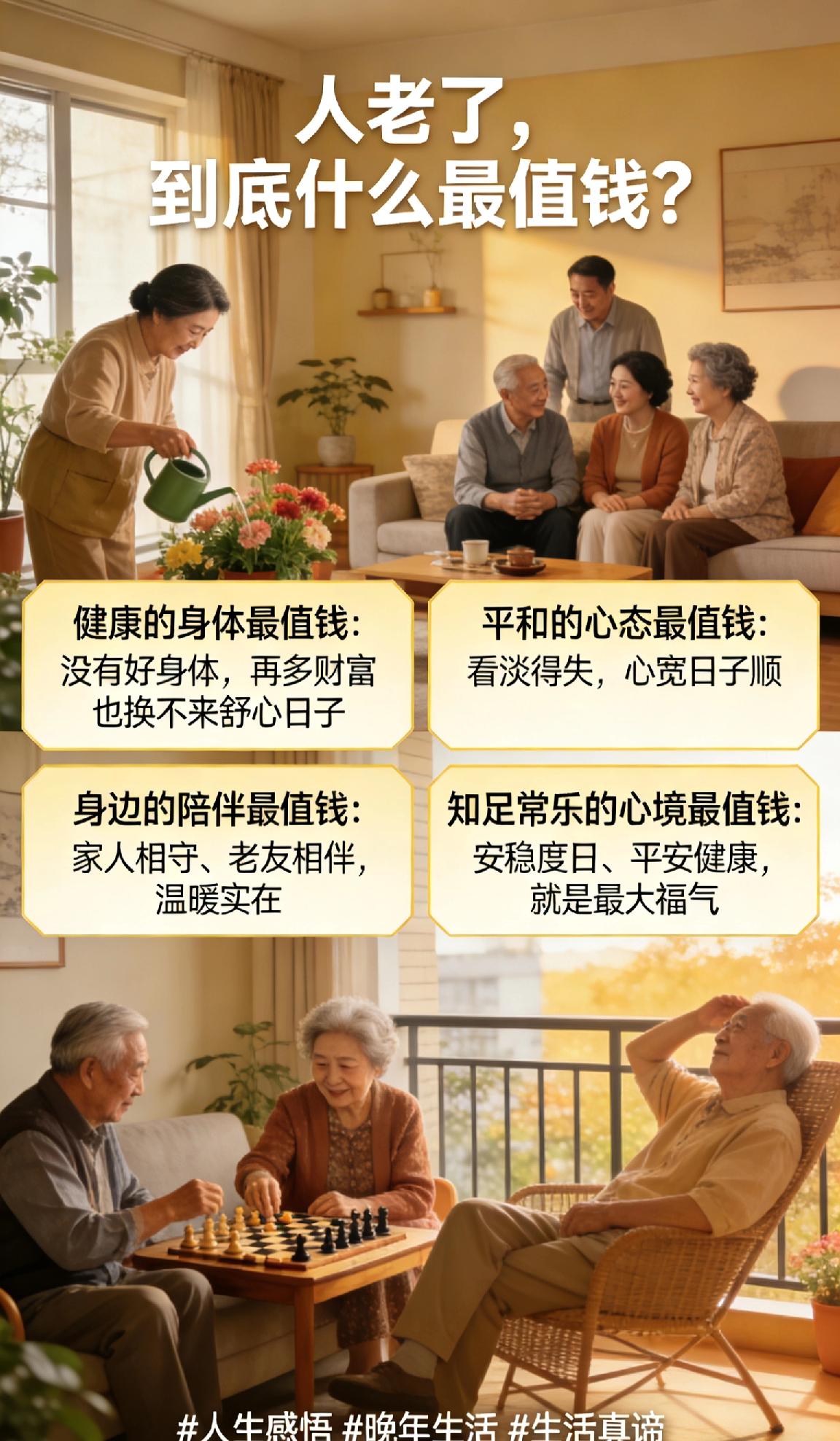 人老了,到底什么最值钱?很多人以为是存款、房产和名利,可真正到了晚年才明白,这些都不是最珍贵的。人老了,健康的身体最值钱,没有好身体,再多财富也换不来舒心日子,吃不好睡不香,晚年只剩煎熬。 平和的心态最值钱,看淡得失、不纠结琐事、不攀比他人,心宽了日子才顺,少生气少烦恼,才能活得轻松自在。身边的陪伴最值钱,有家人相守、老友相伴,遇事有人搭把手,孤单时有人说说话,这份温暖比什么都实在。 知足常乐的心境最值钱,不贪多不求满,安稳度日、平安健康,就是最大的福气。人老了,不求大富大贵,只求身体无恙、心中无忧、身边有人,这才是晚年最值钱的财富。 人生感悟 晚年生活
