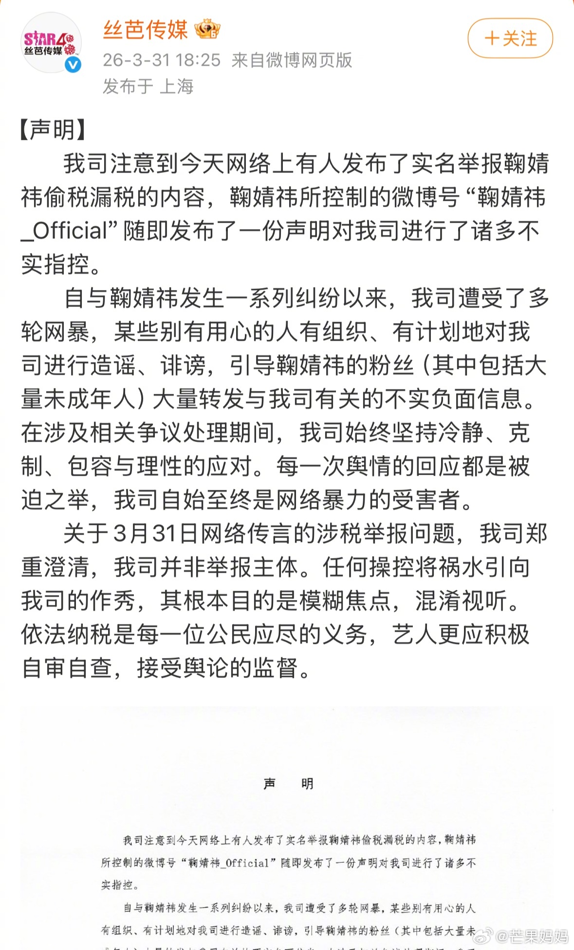 鞠婧祎工作室声明丝芭发布声明回应,称并非“网传鞠婧祎被指控偷税漏税事件”的举报主
