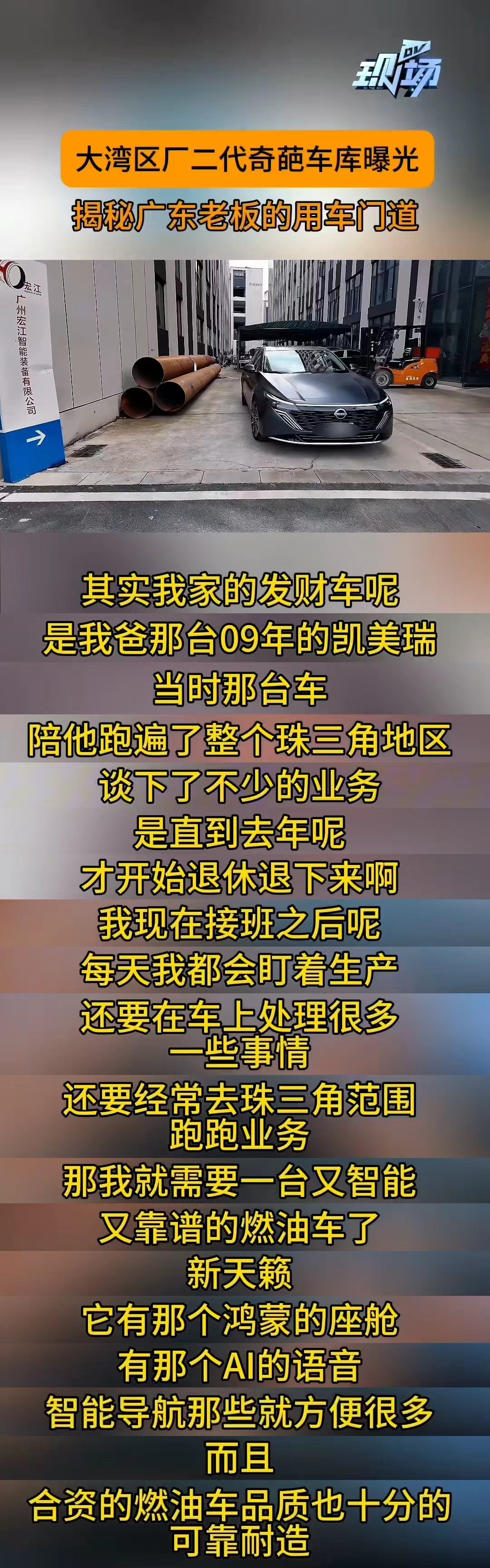 看完“广东厂二代都开什么车”这条片子我的感受是,很多人还在想象“厂二代的车库=清一色豪车”,但真实的湾区制造业车库,往往是另一种混搭——迈巴赫有,保时捷SUV也有,但叉车和天籁反而才是使用频率更高的那两个角色,蛮有意思的一个现象。