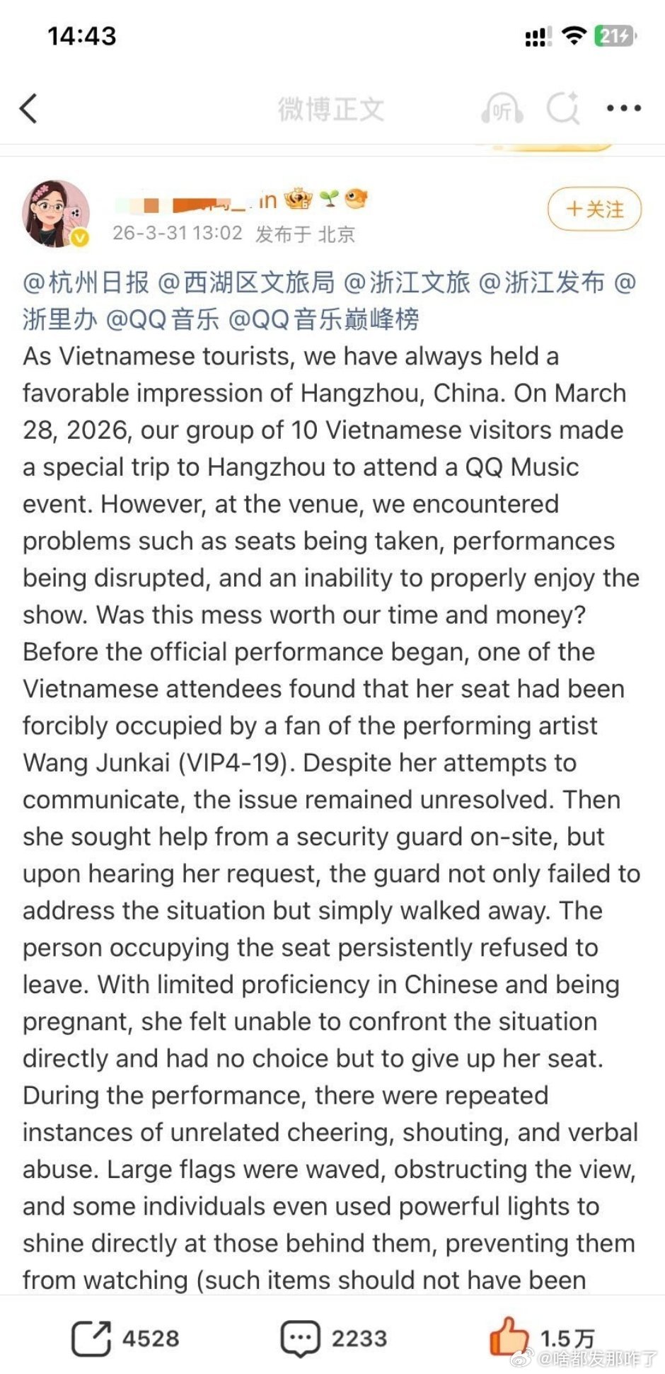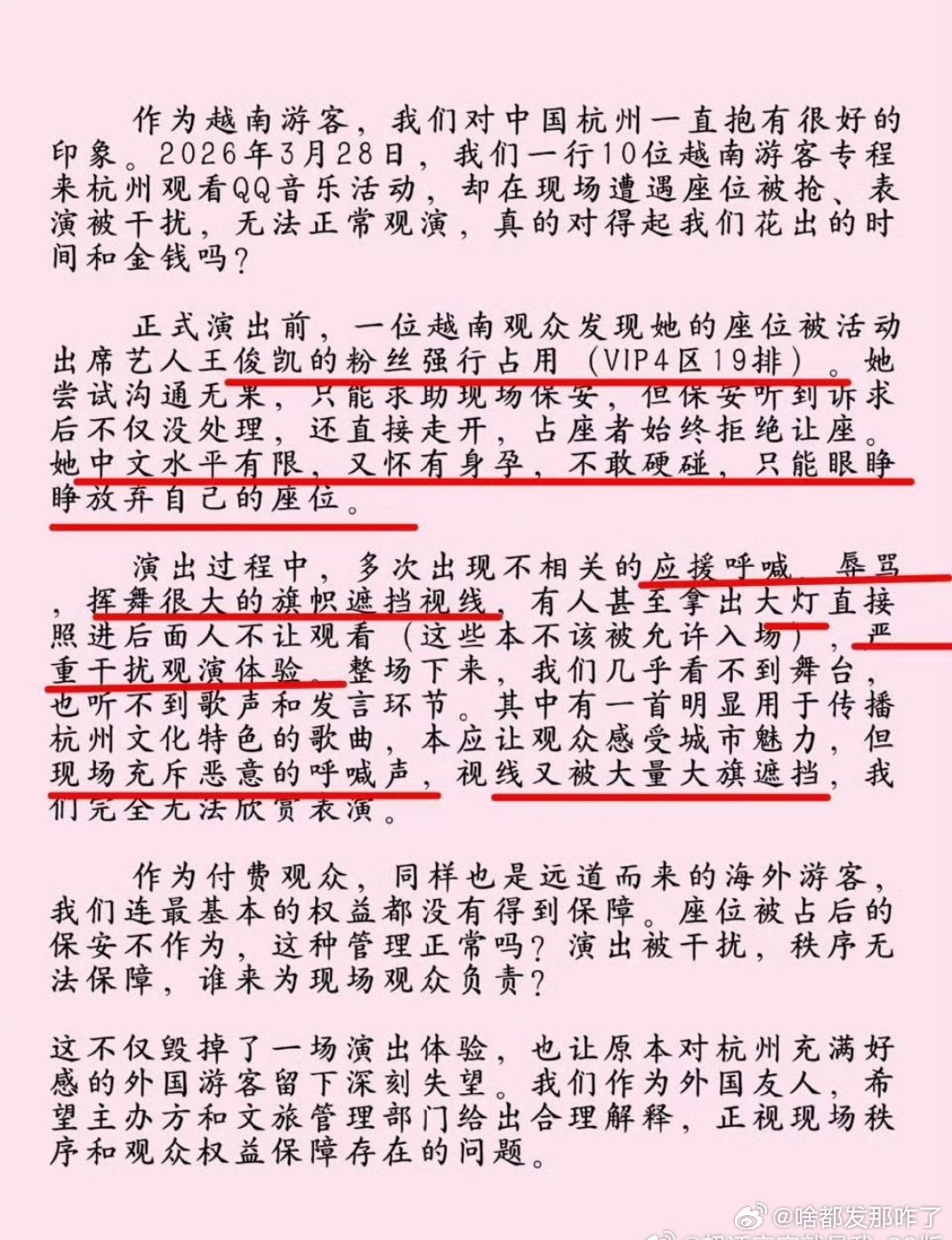 海外孕妇赴杭演唱会被占座王俊凯粉丝?对方可是身怀六甲的孕妇,还跨越山海奔赴现场,