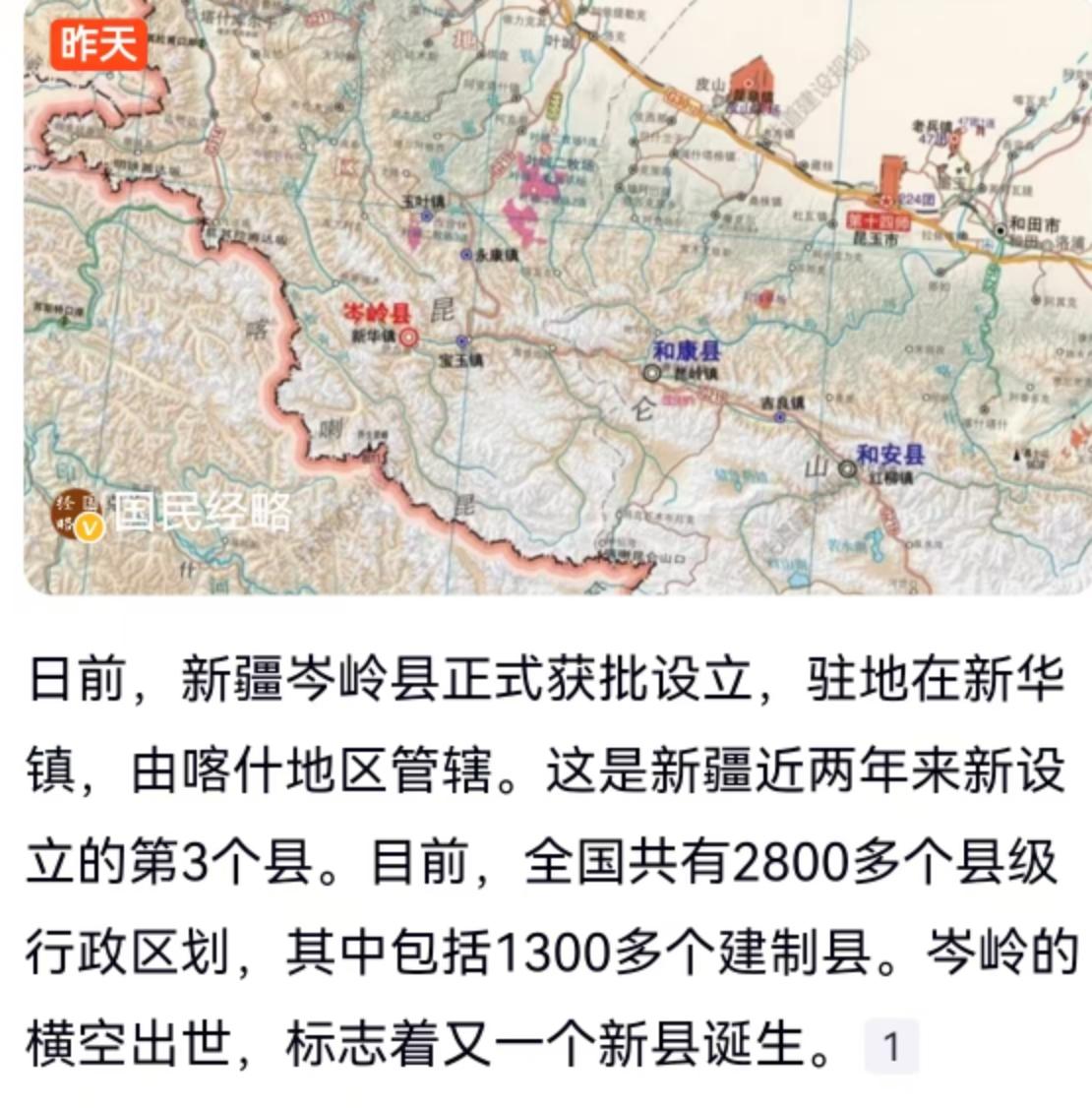 中国版图上又点亮了一个新的坐标。日前新疆岑岭县正式获批设立,驻地定在新华镇,划归喀什地区管辖。这片位于喀什地区西南部、喀喇昆仑山北麓的区域,顺理成章地成了中国当下最年轻的县级行政区。从获批到信息发布间隔极短,堪称“刚刚成立一天”的县域新星。这也是新疆近两年新设立的第3个县。把视野拉宽,目前全国共有2800多个县级行政区划,其中包含1300多个建制县,岑岭的横空出世,让这个庞大的数字群又多了一名新成员。 很多普通人听到“新设县”三个字,第一反应往往是平地起高楼,其实岑岭县的诞生更像是一场扎实的治理升级。它的行政区域主体直接源自原叶城县西合休乡全域,完成了一次从乡到县的三级跨越。甘肃一位网友的留言点破了这背后的地理逻辑,原属的叶城县面积高达2.86万平方公里,体量抵得上内地好几个地级市,更关键的是这里与克什米尔接壤,地缘位置相当特殊。把这片广袤且极具战略纵深的高原区域剥离出来单独设县,本质上是国家在边疆治理上的一次精细化管理升级。 湖北网友敏锐地查到了一个反直觉的数据,这个新县只有6000多人口。用内地动辄几十万上百万人口的县域标准来衡量,6000人简直像个微型小镇。这恰恰反映了西部边疆地区的真实生态。在海拔极高、气候恶劣的喀喇昆仑山深处,生存空间本身就极其受限,地广人稀是常态。人口基数极小,意味着传统的“人口红利型”发展模式在这里完全行不通,它未来的定位绝不可能是大规模的招商引资或者工业制造。 黑龙江网友提到应该有更多汉地名,这背后其实藏着深厚的历史文化脉络。新疆这片土地自古就是多民族交融之地,用中原文化符号命名边疆山川,本身就是国家主权意识与行政管辖权在地理空间上的具象化表达。每一个地名的锚定,都是历史与现实的对话。 从实用角度看,一个小体量新县的设立,最直接的利好是行政权力的下沉与资源的倾斜。以前西合休乡作为一个基层单位,面对突发情况或者需要重大基建投入时,审批链条漫长。如今升级为县级行政区,意味着拥有了独立的财政权、规划权以及更完善的公共服务配套能力。驻地在新华镇,未来这里的医疗、教育、交通应急保障等软硬件设施,都会按照县级标准进行重新配置。对于生活在当地的6000多名居民而言,办事不用再翻山越岭去几十公里外的叶城县城,边境线上的巡逻管控、突发事件响应也会更加高效。读懂了这个逻辑,就能明白这片昆仑深处的新县域,绝非简单的行政区划图上多了一笔,而是国家治理触角向边疆深处延伸的坚实一步。 以上内容仅供参考和借鉴