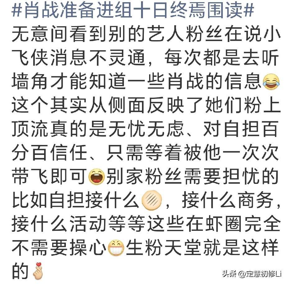 小飞侠名声在外啊,没有脂粉,没有后援会,所有的消息都是听墙角听来的,就是可可爱爱的傻白甜。挺好,肖战这么厉害,粉丝根本不需要操心,生粉天堂啊[比心]