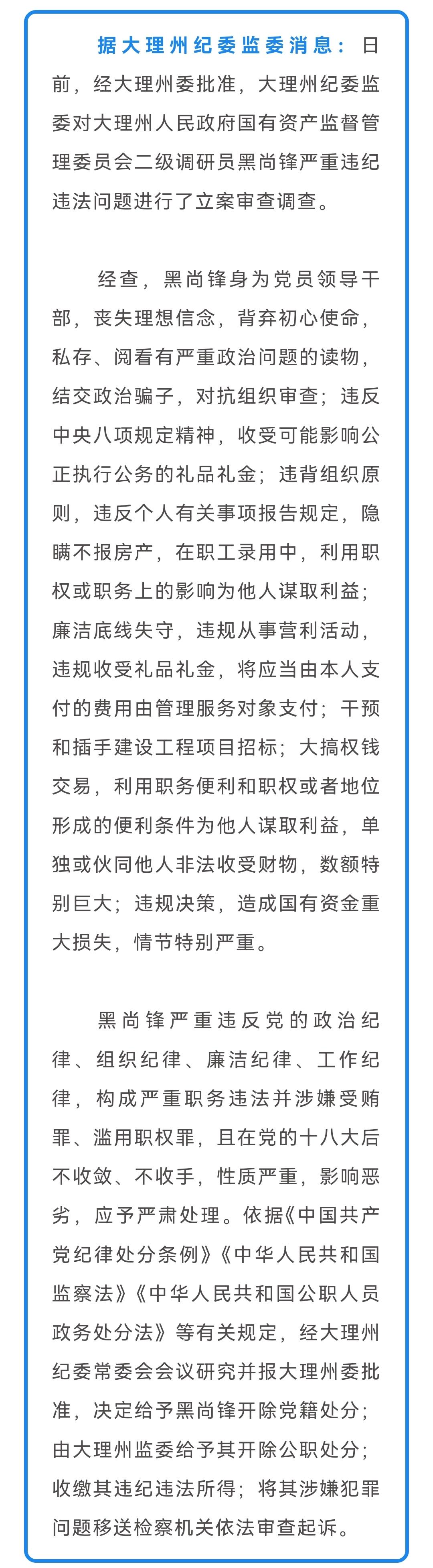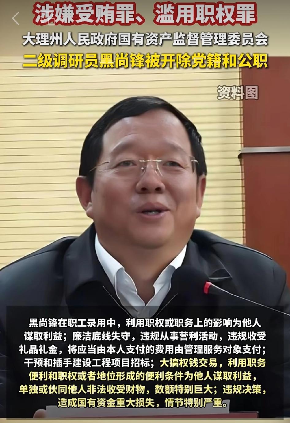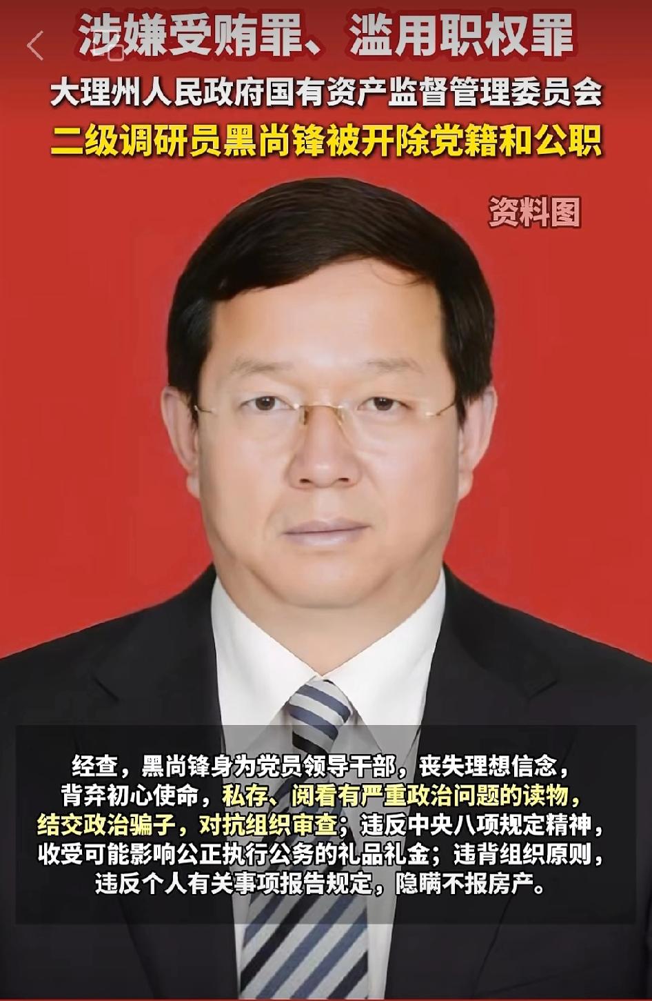 大理州一名二级调研员被开除党籍和公职❗️ 大理州纪委监委这波操作太给力了![加油][加油][加油] 黑尚锋、杨光这俩干部严重违纪违法,真让人愤怒。黑尚锋私存不良读物、结交政治骗子,还干预工程招标,权钱交易数额特别巨大;杨光更是离谱,搞迷信活动、弄虚作假,违规收受礼品礼金,还向企业摊派费用。 他们丧失理想信念,背弃初心使命,在党的十八大、十九大、二十大后都不收手,性质恶劣。纪委监委果断出手,将他们开除党籍和公职,彰显了对腐败零容忍的决心,希望能起到震慑作用,让公职人员都能廉洁奉公。