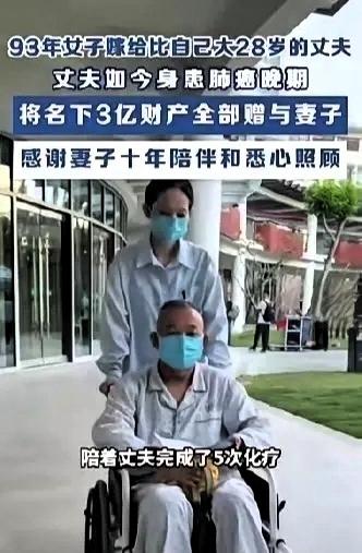 在海南三亚,一名年逾六旬男子因肺癌晚期,将名下价值3亿人民币的财产全部赠予90后妻子。 很多人关注年龄差距与财产数额,却忽略了这段关系里最核心的相守与真心。 两人结婚十年,相处和睦。老人患病后,妻子一直悉心照料,陪伴他接受治疗,全程专注于照顾丈夫的身体与情绪,从未主动提及财产相关事宜。老人有过一段婚姻,也有子女,最终选择将全部财产留给现任妻子,是对十年陪伴与付出的认可。 在老人病重期间,妻子不离不弃、悉心照料,这份患难中的坚守,远比物质更珍贵。老人的赠予,是希望为妻子未来的生活提供保障,是对彼此感情的肯定。 感情的好坏,从来不能用年龄或财富简单定义。十年相守,彼此扶持,在困境中不离不弃,这样的陪伴值得尊重。外界的议论往往只看表面,而真正的感情,藏在日常的照顾与真心的付出里。 真心相待、彼此珍惜,才能在岁月与考验中走得长久。对于这样的选择,你怎么看?