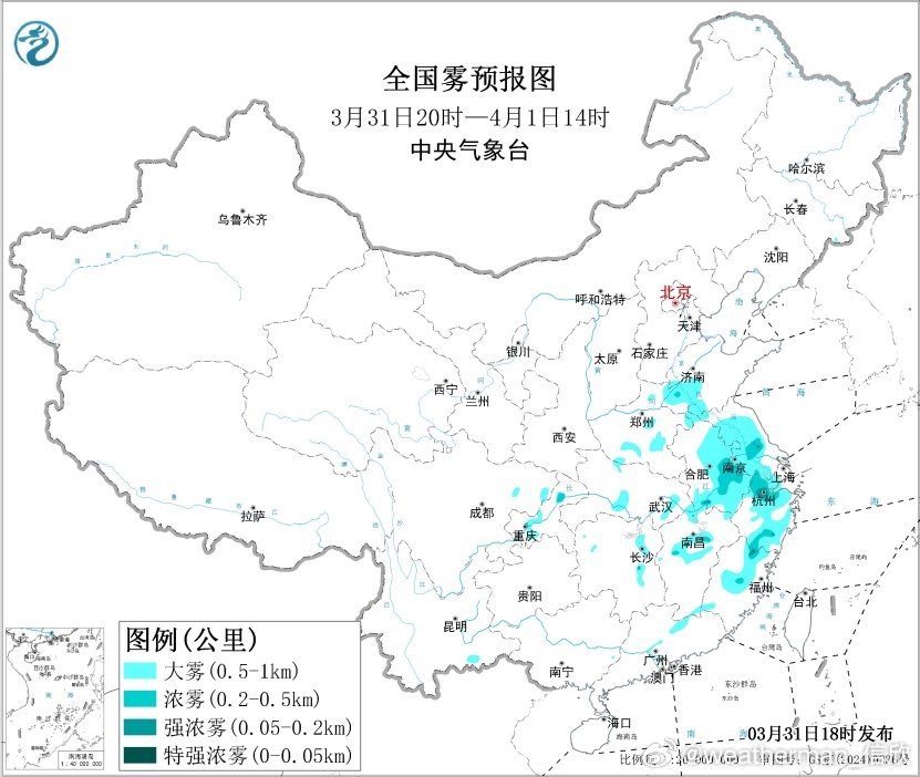 今天18时,中央气象台发布大雾黄色预警:预计,3月31日夜间至4月1日上午,山东南部、安徽中南部、江苏西部、浙江中东部、福建中北部、江西中部以及河南南部、湖南东部、重庆中南部等地的部分地区有大雾,其中,安徽南部、江苏西南部、浙江北部等地局地有能见度不足200米的强浓雾。