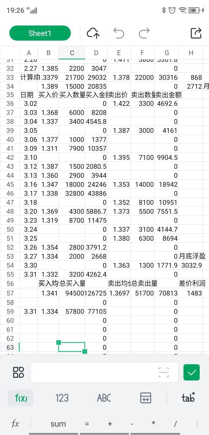 2026年3月,重仓的通信设备etf采用日K线网格交易,中途又做了一些调整,进行了一点点日内网格交易,月底了,总结一下,2月底持仓15000股,浮盈2700多块,价格1.389元,3月底持仓数量达到57800股,价格1.334元,下跌了0.055元,但是通过网格交易,不但没有亏钱,还赚了一点点,浮盈达到3000元,通过网格交易,抵消了下跌的亏损,还略微盈利300元,也不错,比持股不动好的多。3月一共买入了94500股,买入均价1.341元,一共卖出了51700股,卖出均价1.3697元,卖出和买入差价0.0287元,乘以51700股,赚差价1483元,抵消下跌亏损和补仓的亏损,还浮盈300块钱。也很好,只要今后上涨,就会赚钱了,长线持有,网格交易,赚上涨和波动的差价。