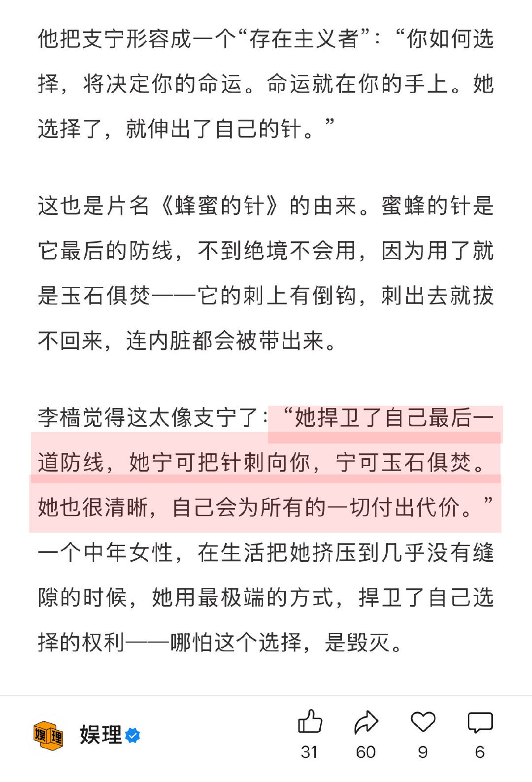 蜂蜜的针演员无人问戏份多少 《蜂蜜的针》演员阵容太豪华!袁泉、宁静、俞飞鸿、齐溪、陈冲、杨子姗、刘雅瑟、窦靖童…编剧李樯透露:“没有人问我有多少场戏。大家觉得这个故事、这个角色吸引她,自然而然就来了,没有乱七八糟的要求。" 李樯说蜂蜜的针是失而复得