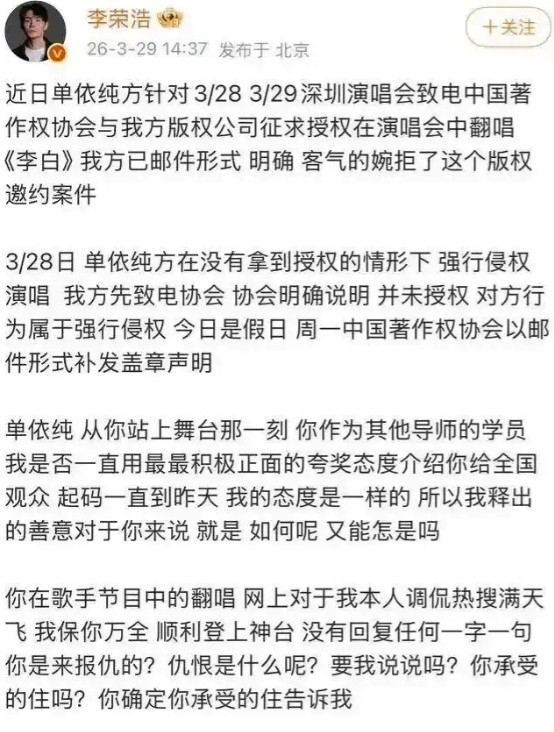 在演唱会上滴几滴泪,就一大堆粉丝出来说妹妹要坚强。 不知道心疼什么,明明被欺负的是李荣浩啊! 没有经过词曲作者就演唱人家歌曲,个人和公司侵犯李荣浩的广播权和表演权,要追究责任,不是道歉就完事儿。 没有底线的艺人,唱腔再好,也会人缘散尽的!