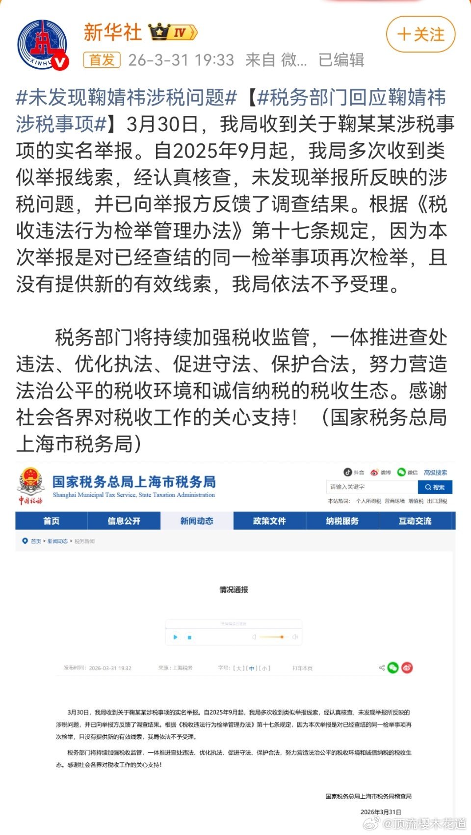 未发现鞠婧祎涉税问题恭喜鞠婧祎【税务部门回应鞠婧祎涉税事项 】税务部门干活真快