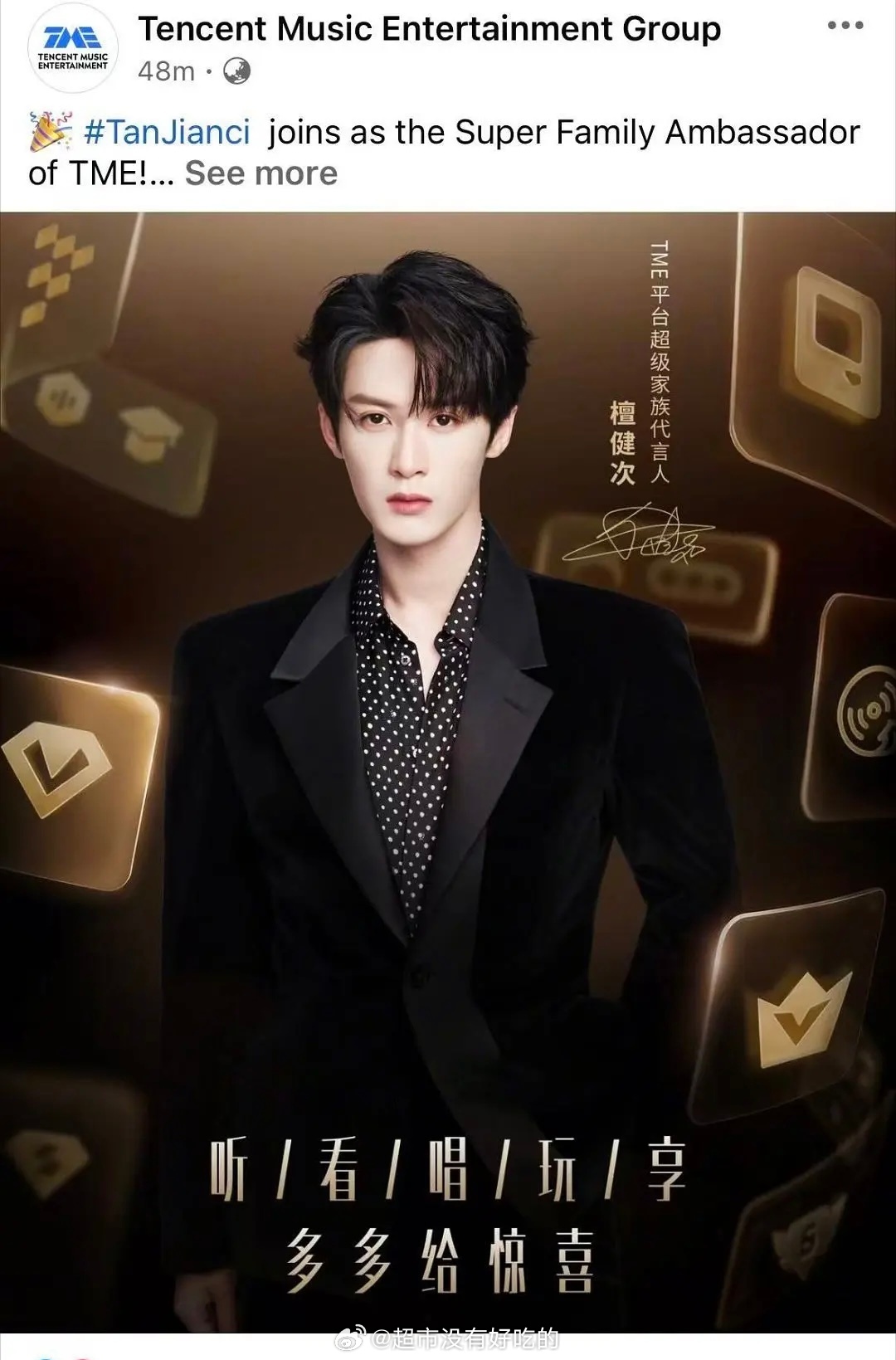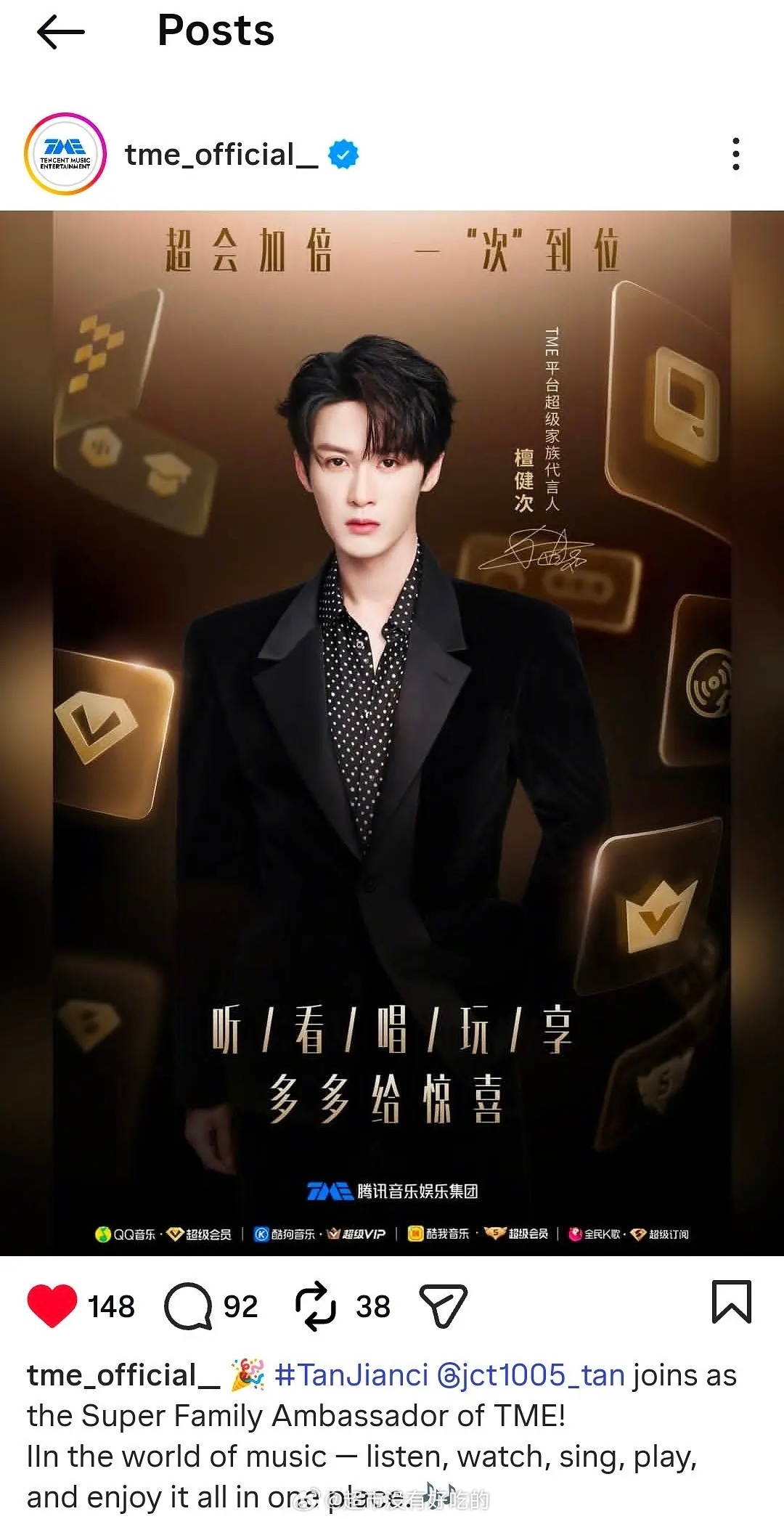 檀健次TME今天在外网也同步官宣了全平台+外网TME官方账号,三大平台同步官宣不愧是首位集团代言人 排面待遇拉满,恭喜健次🎉檀健次檀健次