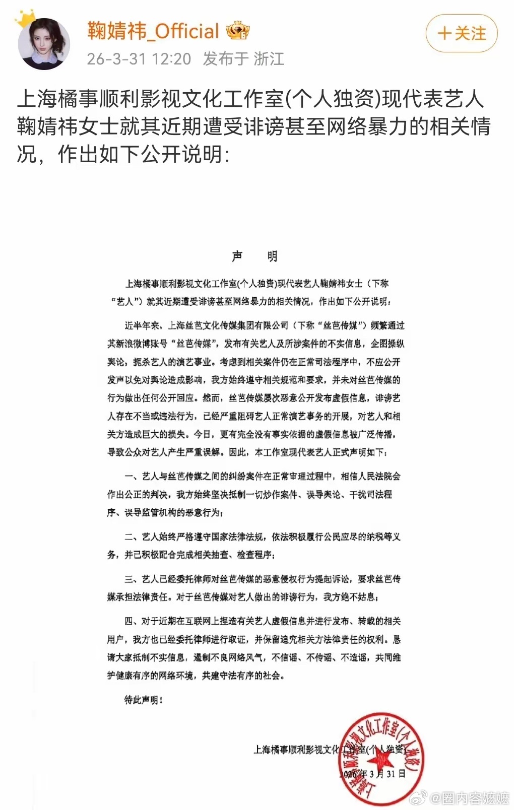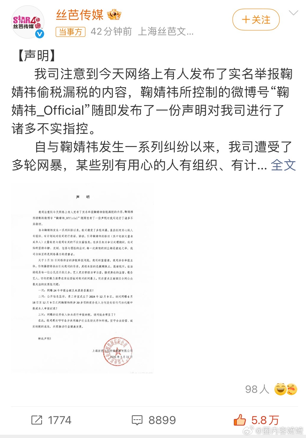 丝芭传媒回应鞠婧祎,实名举报“偷税漏税”与本公司无关!