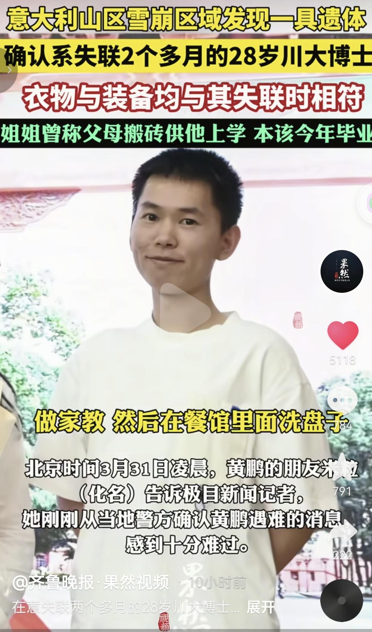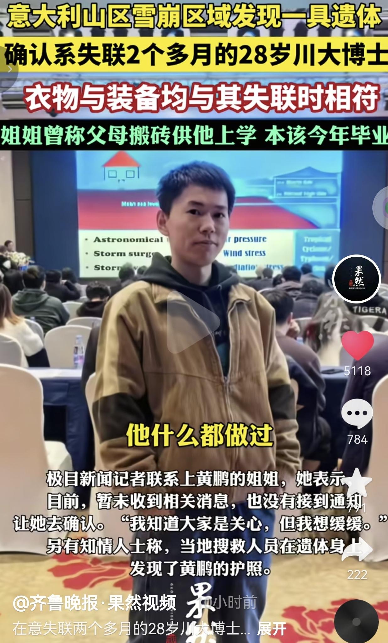 破防了!失联两个多月的28岁川大博士黄鹏,最终还是没能等来奇迹——意大利多洛米蒂山区的雪崩现场,救援人员找到了他的遗体,衣物装备和失联时完全吻合,这个本该今年毕业、前途无量的孩子,永远停在了28岁! 黄鹏是谁?是父母眼里最争气的孩子,是全村的骄傲!姐姐说,父母一辈子在工地搬砖,省吃俭用把他供到博士,他从上学起就没让家里操过心,上大学就开始勤工俭学,做家教、洗盘子,什么苦活累活都干,就为了给家里减轻负担。 他特别乖,特别懂事,一辈子勤劳节俭,把所有时间都花在学习上,没什么不良嗜好,朋友都说他真诚、踏实,是个眼里只有学术的好孩子。 好不容易熬到博士毕业,本以为能带着父母过上好日子,能在自己热爱的领域发光发热,可谁能想到,一场突如其来的雪崩,把一切都毁了! 当地时间1月19日,黄鹏在意大利多洛米蒂山区徒步时遭遇雪崩失联。 两个多月里,家人、朋友、救援人员从来没放弃过,一次次进山搜救,一次次抱着希望等待,可等来的,却是最残忍的结果。 3月30日,德奥游客在雪崩区域发现了他的遗体,3月30日晚,相关部门正式确认身份,这个消息,直接把黄鹏的家人击垮了。 姐姐在采访里说,“我知道大家是关心,但我想缓缓”,短短一句话,道尽了多少绝望和心碎!父母搬砖供出来的博士,还没来得及孝敬父母,还没来得及看看自己努力换来的好日子,就这么没了! 网友评论区直接哭崩,全是心疼的声音,有的网友说:看得我眼泪止不住流!父母搬砖供出来的博士,就这么没了,这对老两口后半辈子怎么活啊! 也有的网友说:黄鹏学长一路走好!太可惜了,明明马上就要毕业了,明明未来一片光明,太让人难受了! 还有的网友说:我家孩子也在国外读书,看到这个消息我心都揪紧了!孩子是父母的命啊,白发人送黑发人,太残忍了! 也有的网友说:在国外留学真的不容易,尤其是这种农村出来的孩子,一步一个脚印走到博士,太不容易了,愿天堂没有雪崩! 说实话,我敲这些字的时候,手都在抖,心里堵得慌。 我们总说“知识改变命运”,黄鹏就是这句话最真实的写照。从农村出来,靠自己的努力,靠父母的血汗,一步步读到川大博士,留学深造,他本是那个“逆天改命”的范本,是全家的希望,是全村的骄傲。 可一场雪崩,把所有的努力、所有的期待、所有的未来,全砸得粉碎。 最让人心疼的,是他的父母。一辈子在工地搬砖,起早贪黑,省吃俭用,把所有的钱都砸在孩子身上,就盼着孩子毕业,盼着孩子出息,盼着自己能享享清福。 可到头来,盼来的却是孩子的死讯,这是什么样的打击?这是要了老两口的命啊! 黄鹏懂事,懂事到让人心疼。他勤工俭学,不给家里添负担;他努力学习,不辜负父母的期望;他踏实做人,没什么不良嗜好。 可就是这么好的一个孩子,却没能躲过这场天灾,没能等到毕业,没能孝敬父母,太让人意难平了! 我们总说“来日方长”,可意外和明天,谁也不知道哪个先来。黄鹏的故事,给所有在外打拼、留学的年轻人提了醒,也给所有父母提了醒:平安,才是最大的福气;活着,才是对父母最大的孝敬。 这个世界上,最残忍的事,莫过于白发人送黑发人,莫过于希望变绝望。 黄鹏走了,可他的父母,还要带着这份痛苦,活下去。我们能做的,只有默默祈祷,祈祷老两口能挺过这一关,祈祷黄鹏在天堂,没有雪崩,没有痛苦,只有阳光和温暖。 黄鹏,一路走好!愿你在另一个世界,平安顺遂,不再有遗憾!